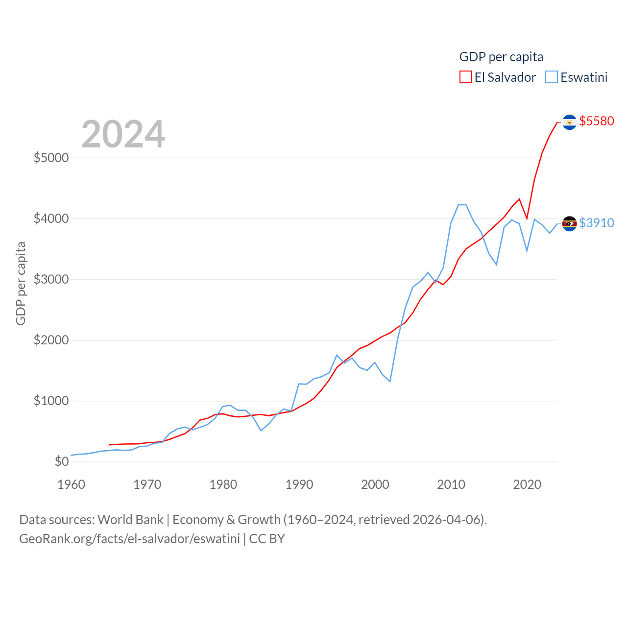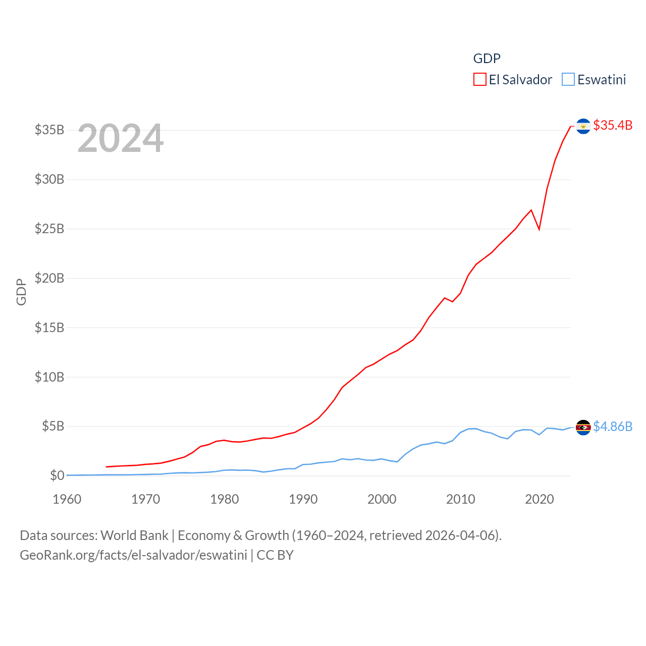 By GDP, El Salvador ranks 105/197 ($35.4B) and Eswatini ranks 162/197 ($4.86B). By GDP per capita, El Salvador ranks 116/197 ($5,580), while Eswatini ranks 131/197 ($3,910).
