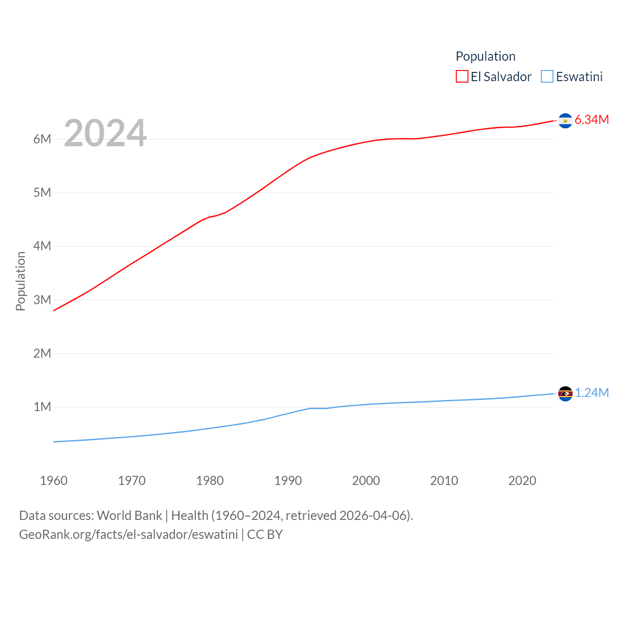 El Salvador has a population of 6.34M (ranked 111/197), compared with 1.24M in Eswatini (ranked 157/197). El Salvador's land area is 8,000 sq mi versus 6,641 sq mi for Eswatini (ranked 150th vs. 154th).