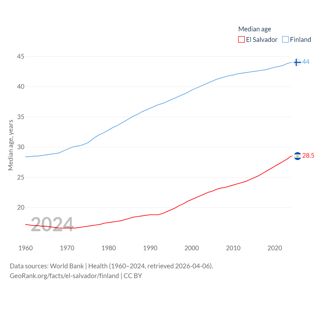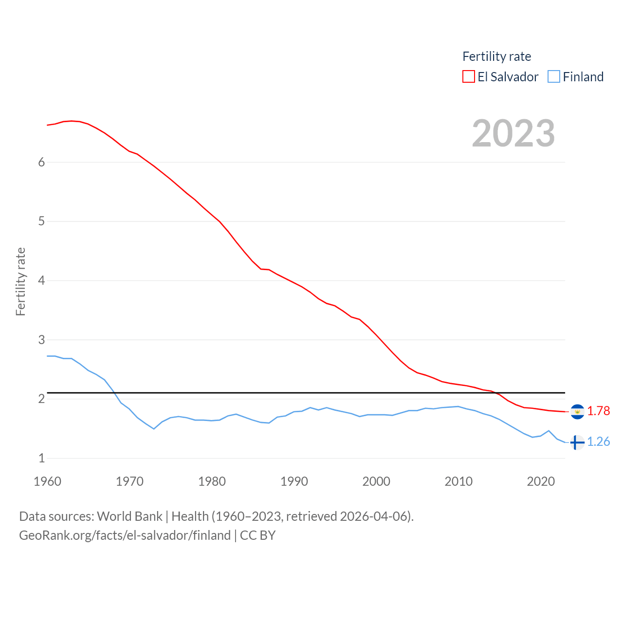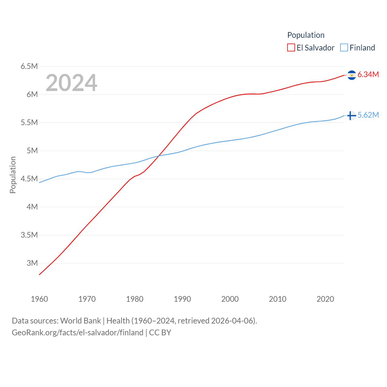 El Salvador has a population of 6.34M (ranked 111/197), compared with 5.62M in Finland (ranked 116/197). El Salvador's land area is 8,000 sq mi versus 117,360 sq mi for Finland (ranked 150th vs. 70th).
