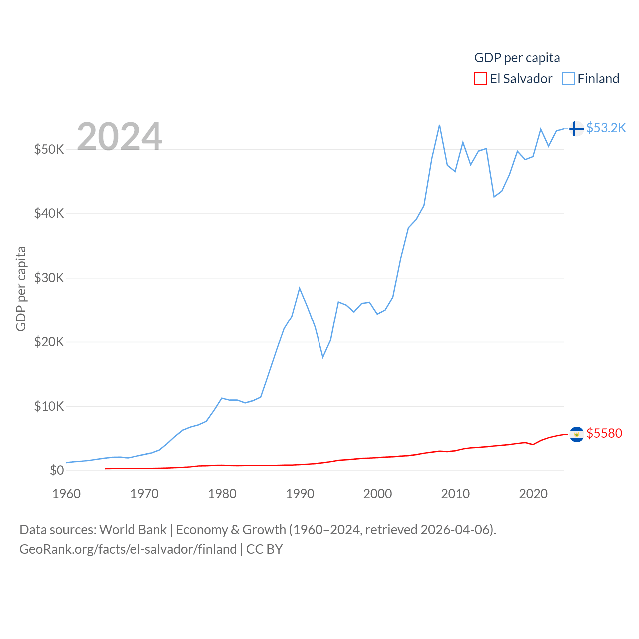 By GDP, El Salvador ranks 105/197 ($35.4B) and Finland ranks 47/197 ($299B). By GDP per capita, El Salvador ranks 116/197 ($5,580), while Finland ranks 23/197 ($53,150).
