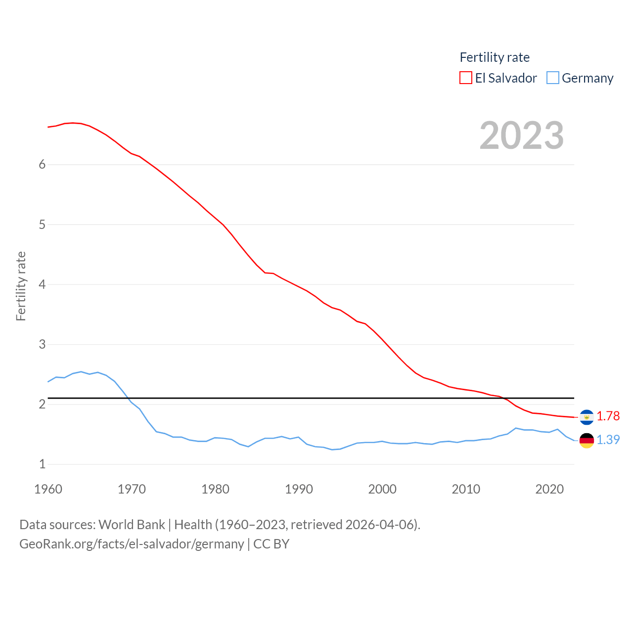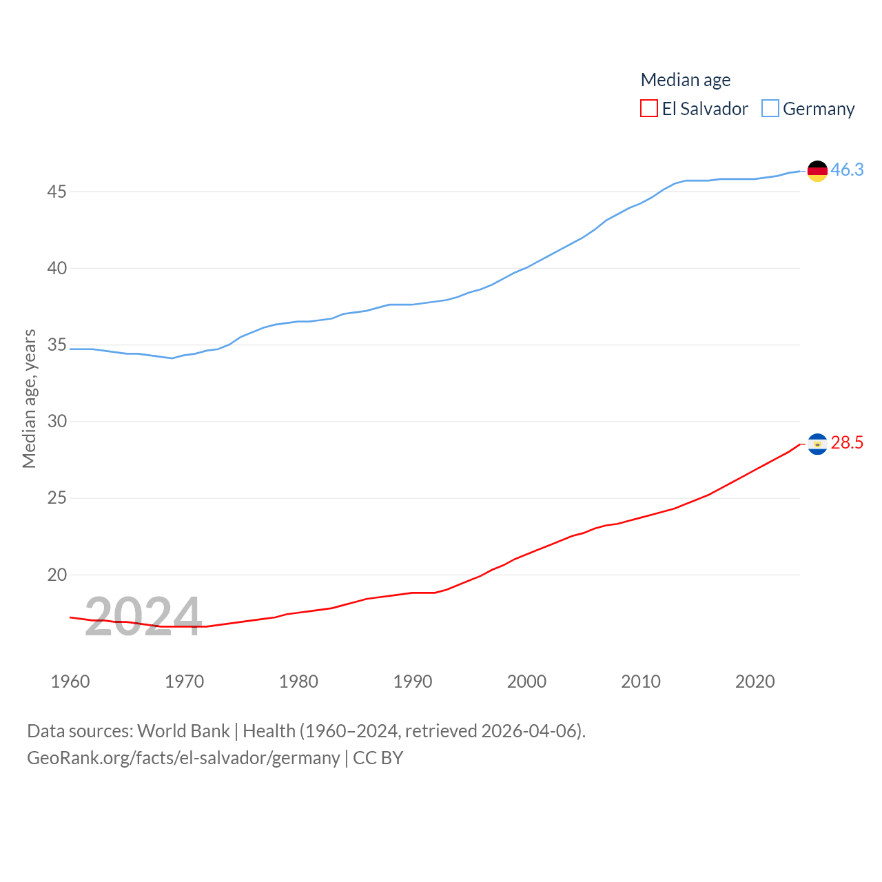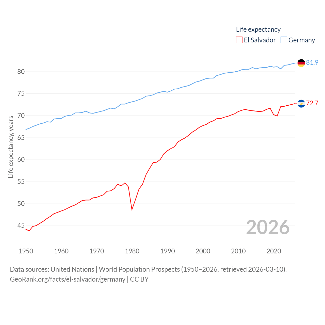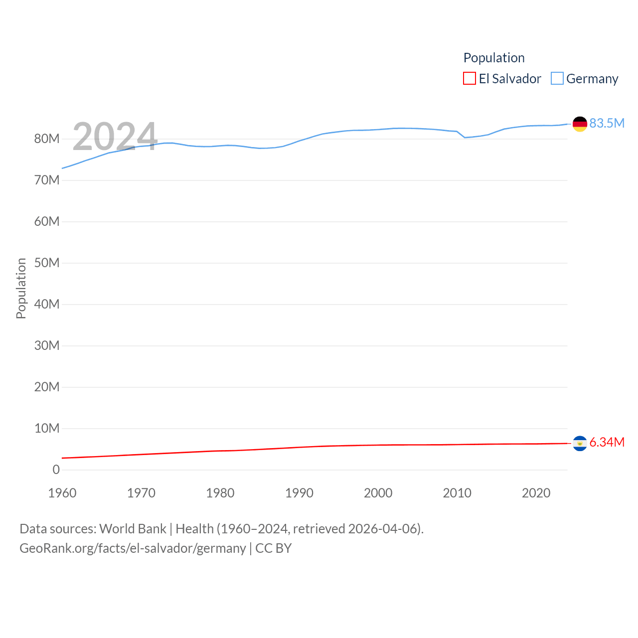 El Salvador has a population of 6.34M (ranked 111/197), compared with 83.5M in Germany (ranked 19/197). El Salvador's land area is 8,000 sq mi versus 134,916 sq mi for Germany (ranked 150th vs. 63rd).