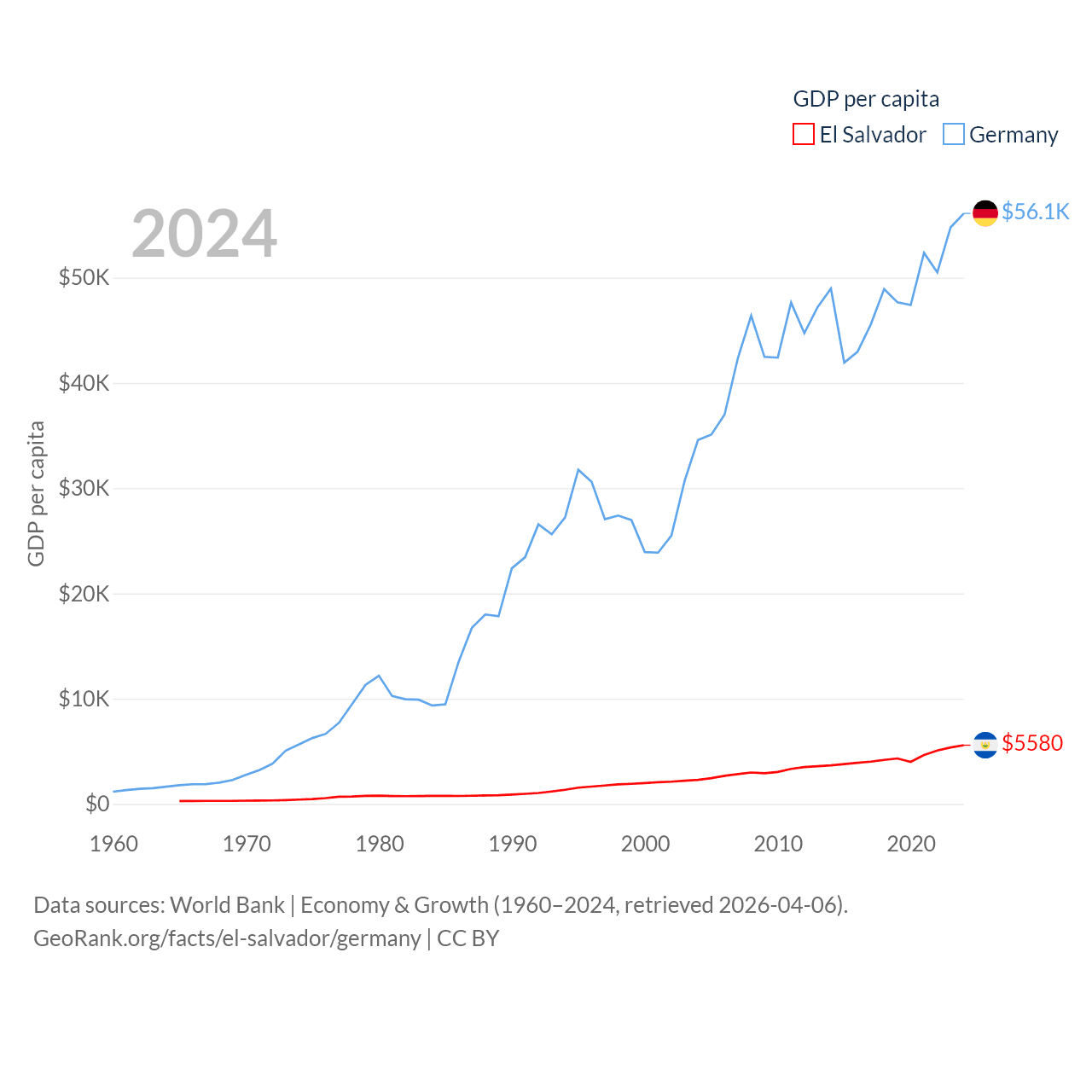 By GDP, El Salvador ranks 105/197 ($35.4B) and Germany ranks 3/197 ($4.69T). By GDP per capita, El Salvador ranks 116/197 ($5,580), while Germany ranks 19/197 ($56,104).