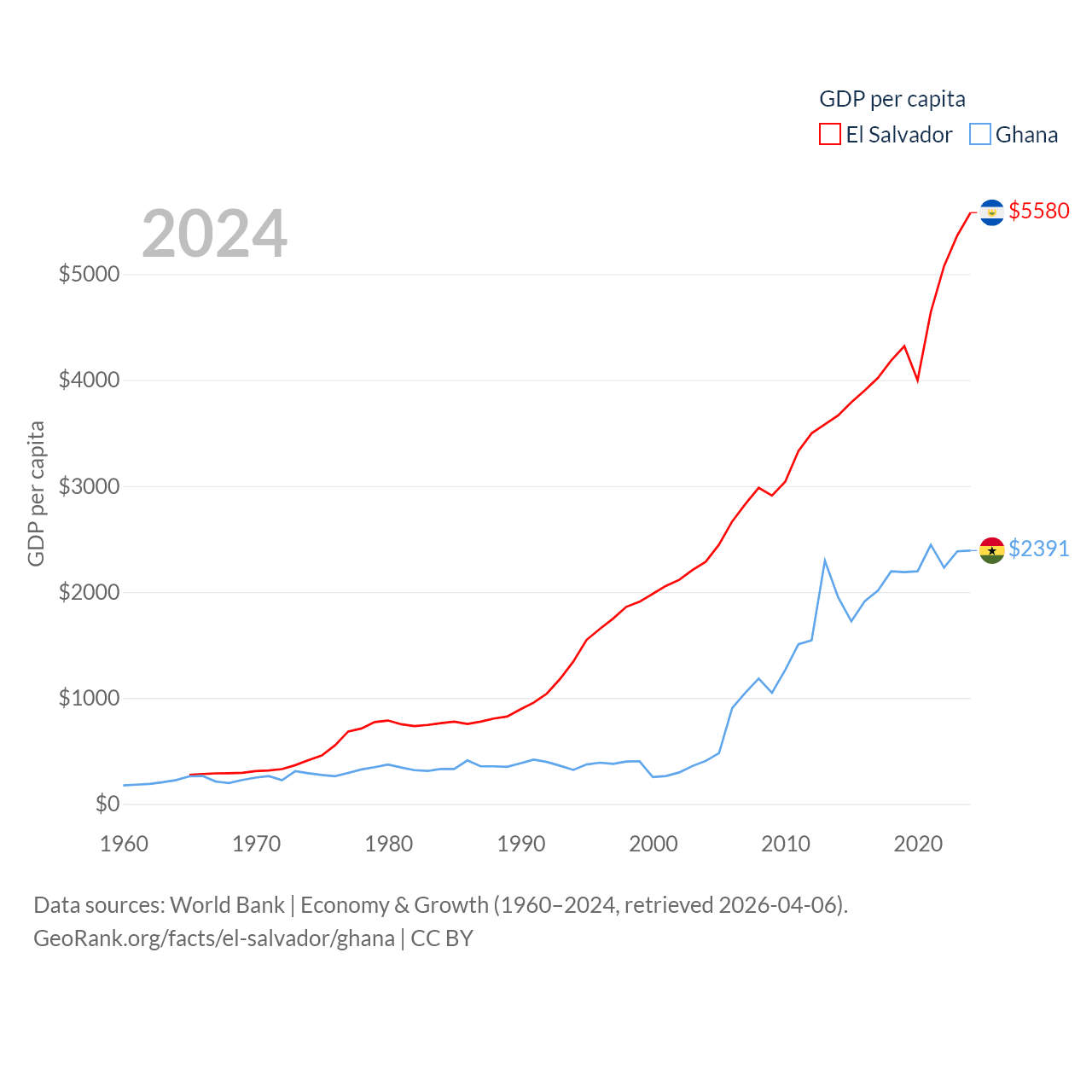 By GDP, El Salvador ranks 105/197 ($35.4B) and Ghana ranks 80/197 ($82.3B). By GDP per capita, El Salvador ranks 116/197 ($5,580), while Ghana ranks 151/197 ($2,391).