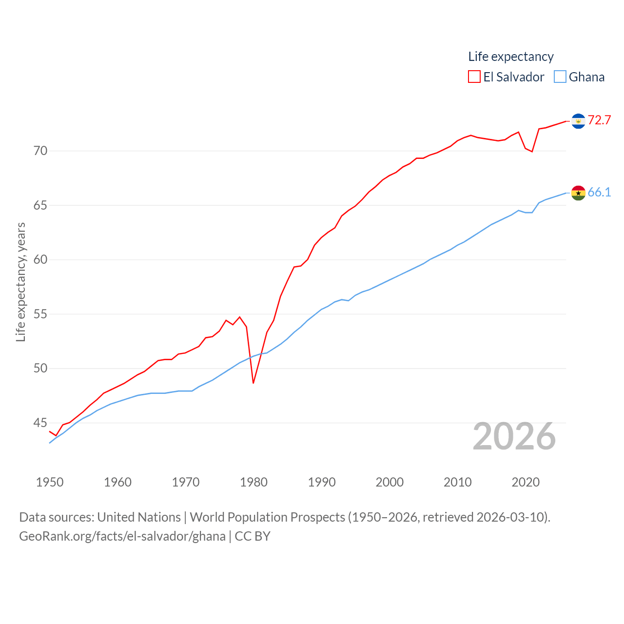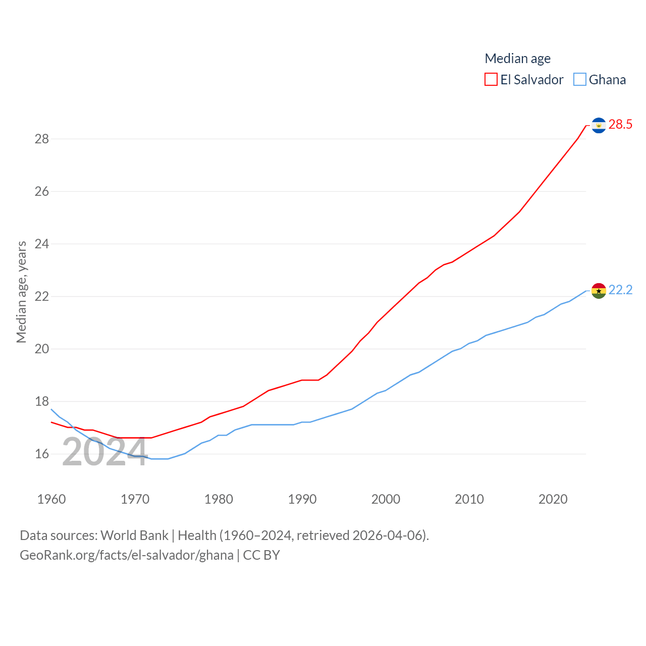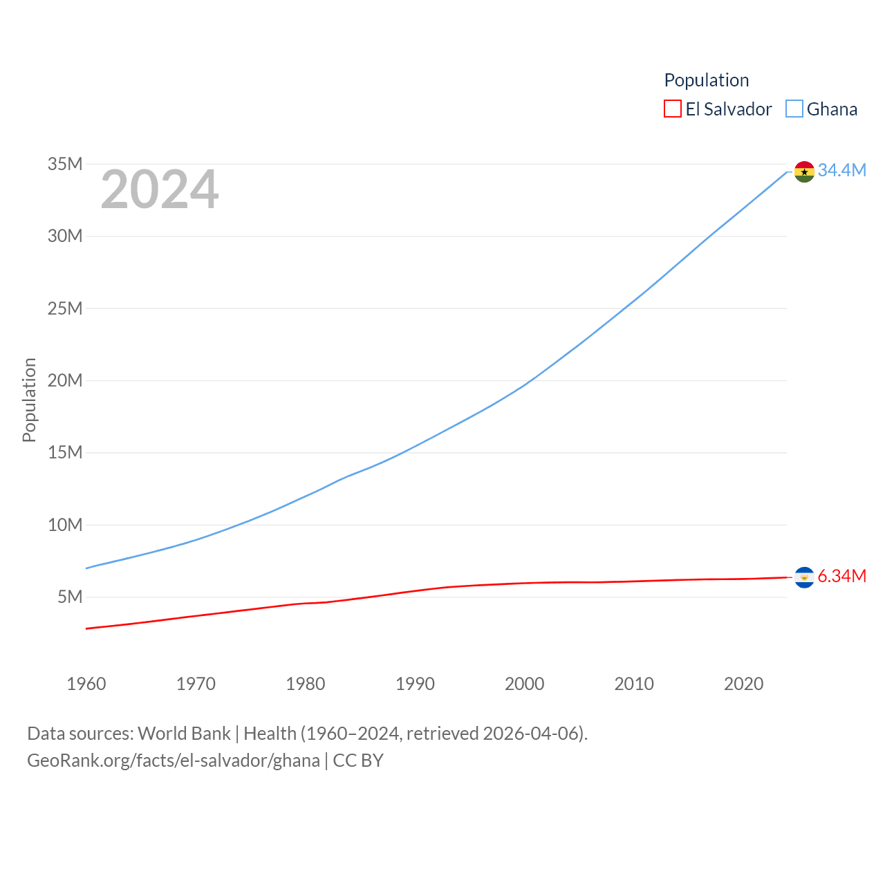 El Salvador has a population of 6.34M (ranked 111/197), compared with 34.4M in Ghana (ranked 47/197). El Salvador's land area is 8,000 sq mi versus 87,851 sq mi for Ghana (ranked 150th vs. 81st).