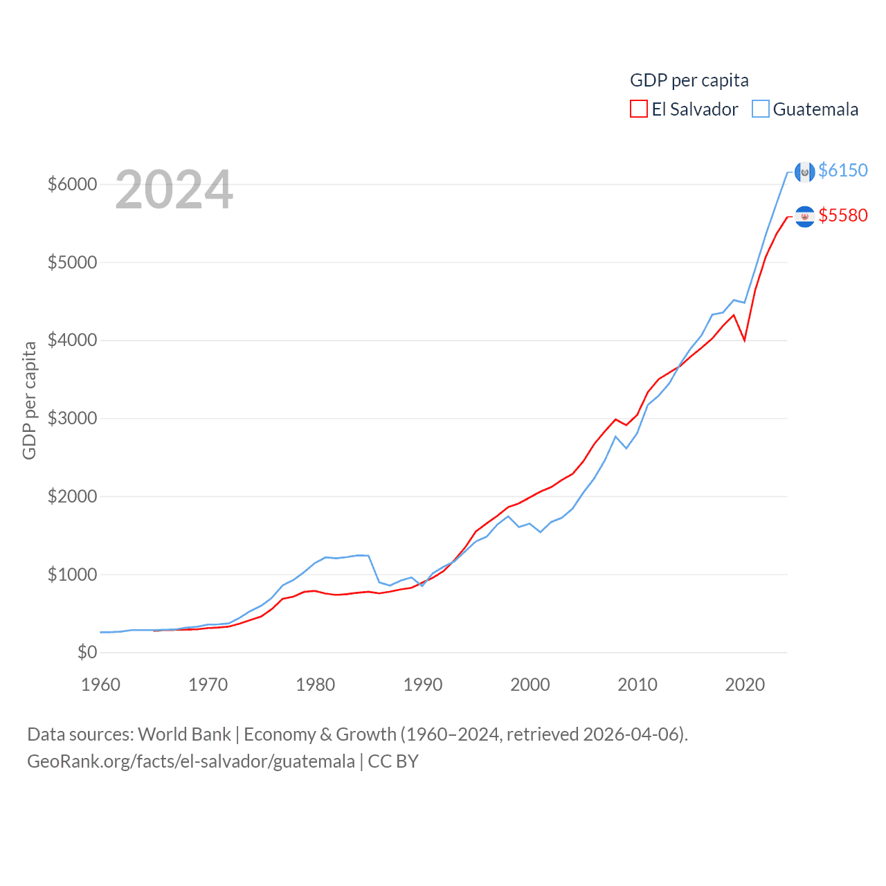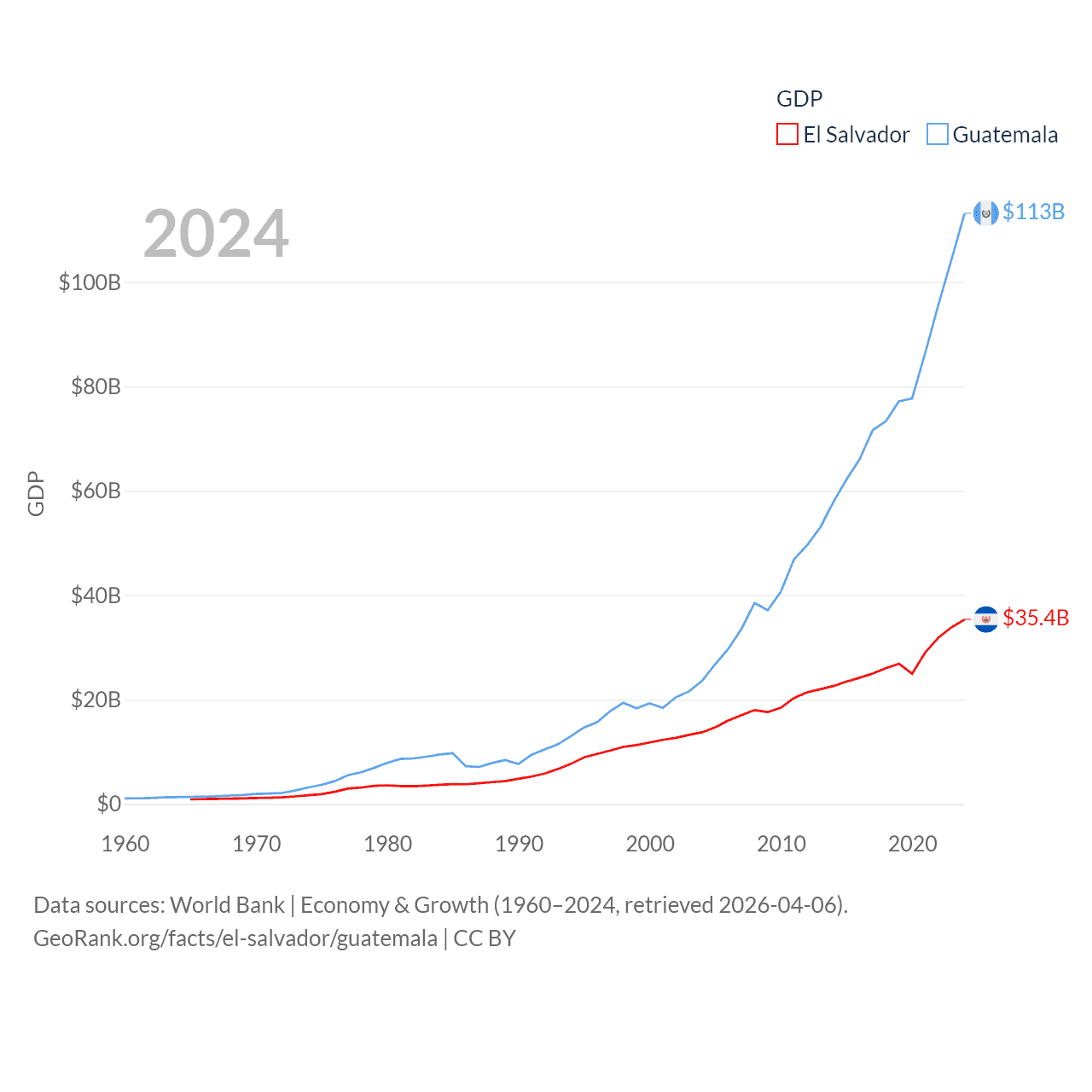 By GDP, El Salvador ranks 105/197 ($35.4B) and Guatemala ranks 68/197 ($113B). By GDP per capita, El Salvador ranks 116/197 ($5,580), while Guatemala ranks 112/197 ($6,150).