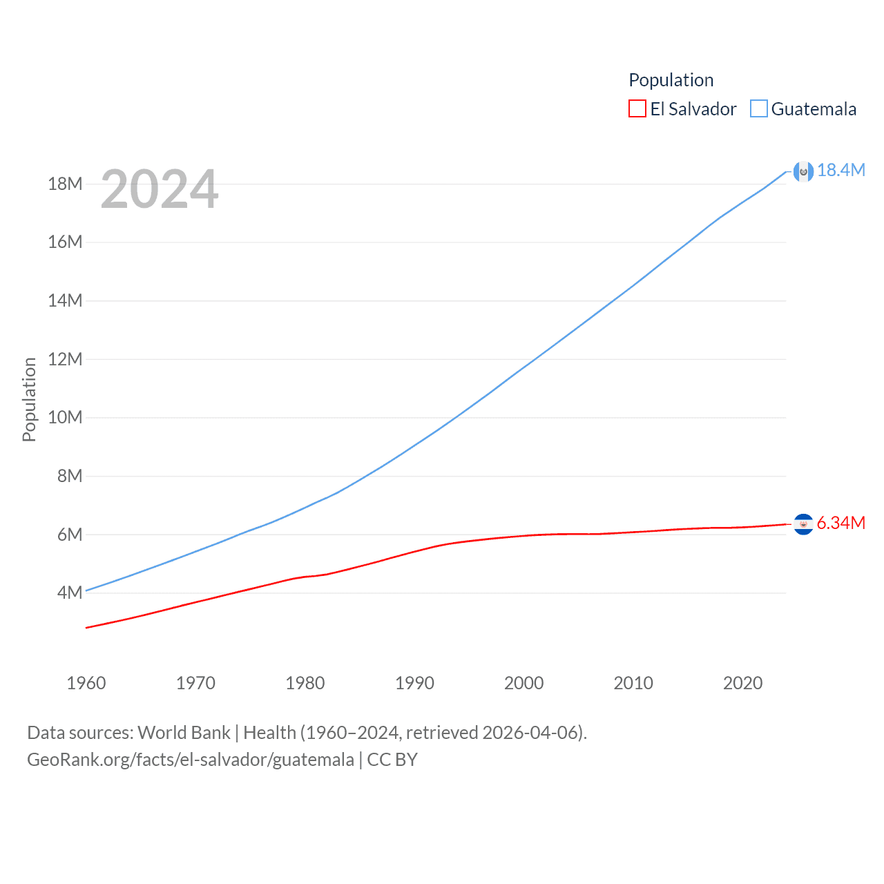 El Salvador has a population of 6.34M (ranked 111/197), compared with 18.4M in Guatemala (ranked 70/197). El Salvador's land area is 8,000 sq mi versus 41,375 sq mi for Guatemala (ranked 150th vs. 102nd).