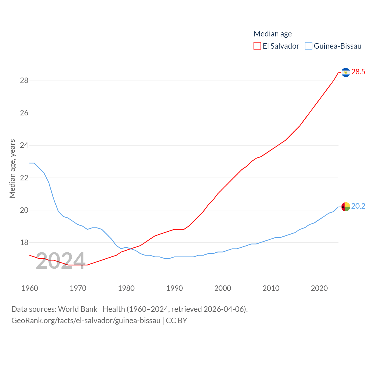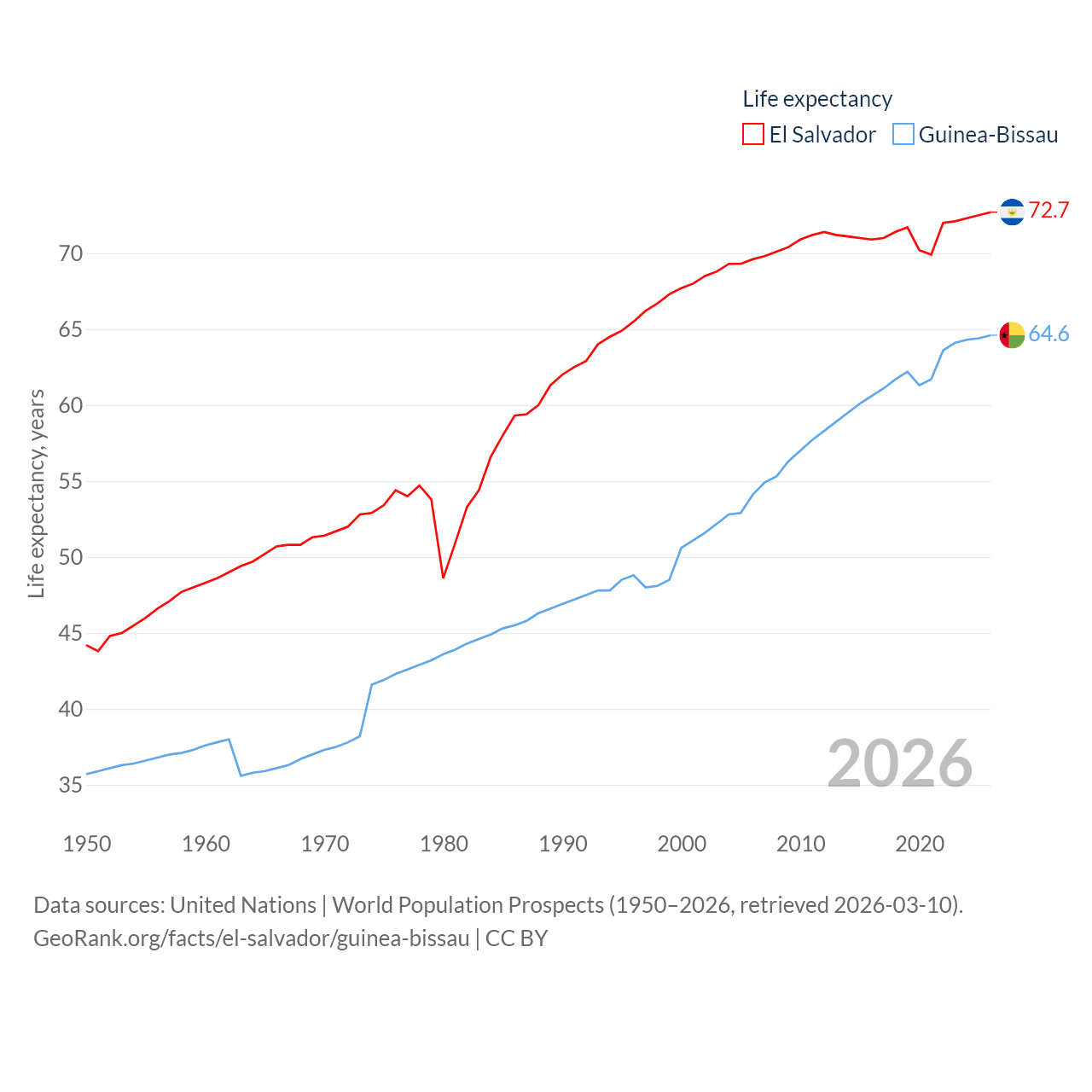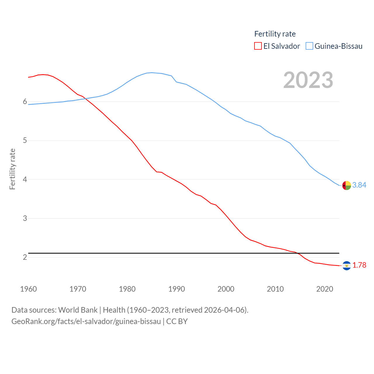 El Salvador has a population of 6.34M (ranked 111/197), compared with 2.2M in Guinea-Bissau (ranked 146/197). El Salvador's land area is 8,000 sq mi versus 10,857 sq mi for Guinea-Bissau (ranked 150th vs. 139th).