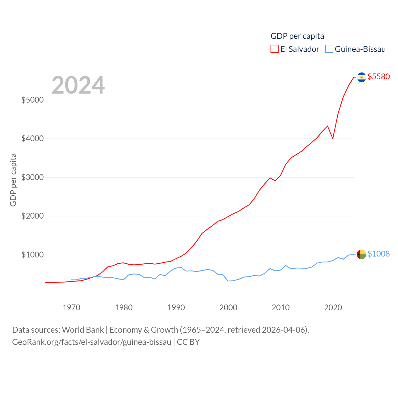 By GDP, El Salvador ranks 105/197 ($35.4B) and Guinea-Bissau ranks 176/197 ($2.22B). By GDP per capita, El Salvador ranks 116/197 ($5,580), while Guinea-Bissau ranks 177/197 ($1,008).