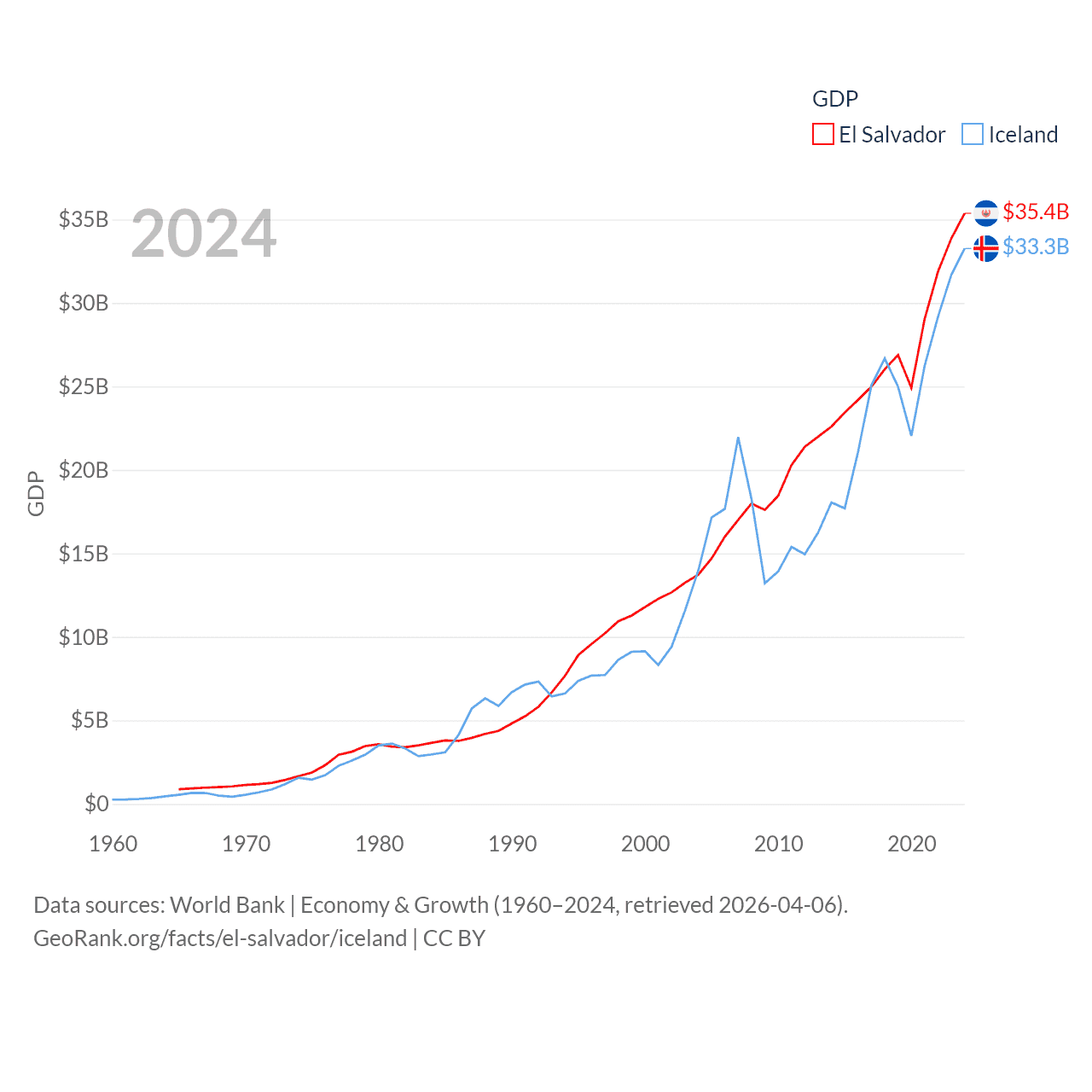 By GDP, El Salvador ranks 105/197 ($35.4B) and Iceland ranks 108/197 ($33.3B). By GDP per capita, El Salvador ranks 116/197 ($5,580), while Iceland ranks 9/197 ($86,041).