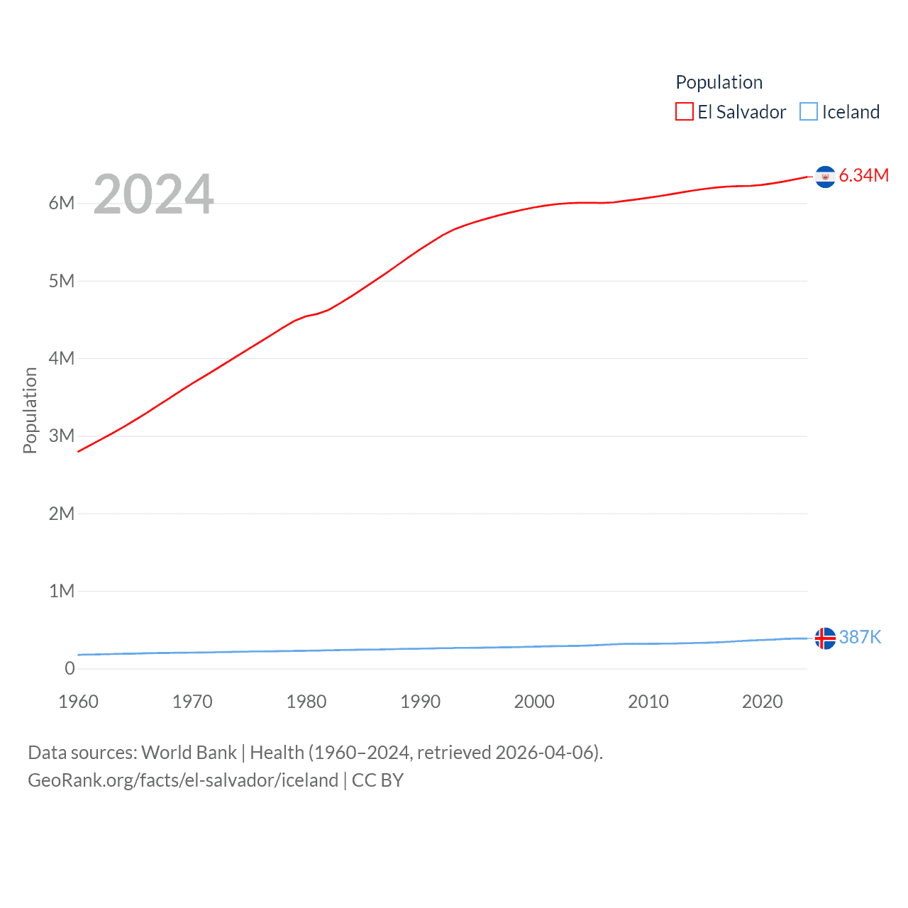 El Salvador has a population of 6.34M (ranked 111/197), compared with 387K in Iceland (ranked 173/197). El Salvador's land area is 8,000 sq mi versus 38,931 sq mi for Iceland (ranked 150th vs. 104th).
