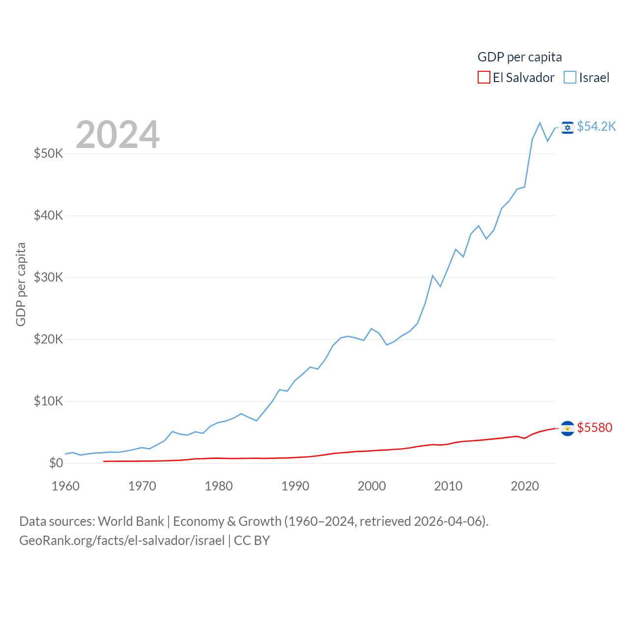 By GDP, El Salvador ranks 105/197 ($35.4B) and Israel ranks 29/197 ($540B). By GDP per capita, El Salvador ranks 116/197 ($5,580), while Israel ranks 21/197 ($54,177).
