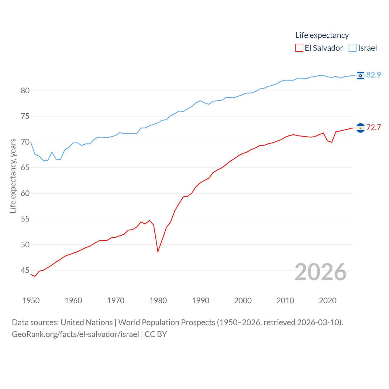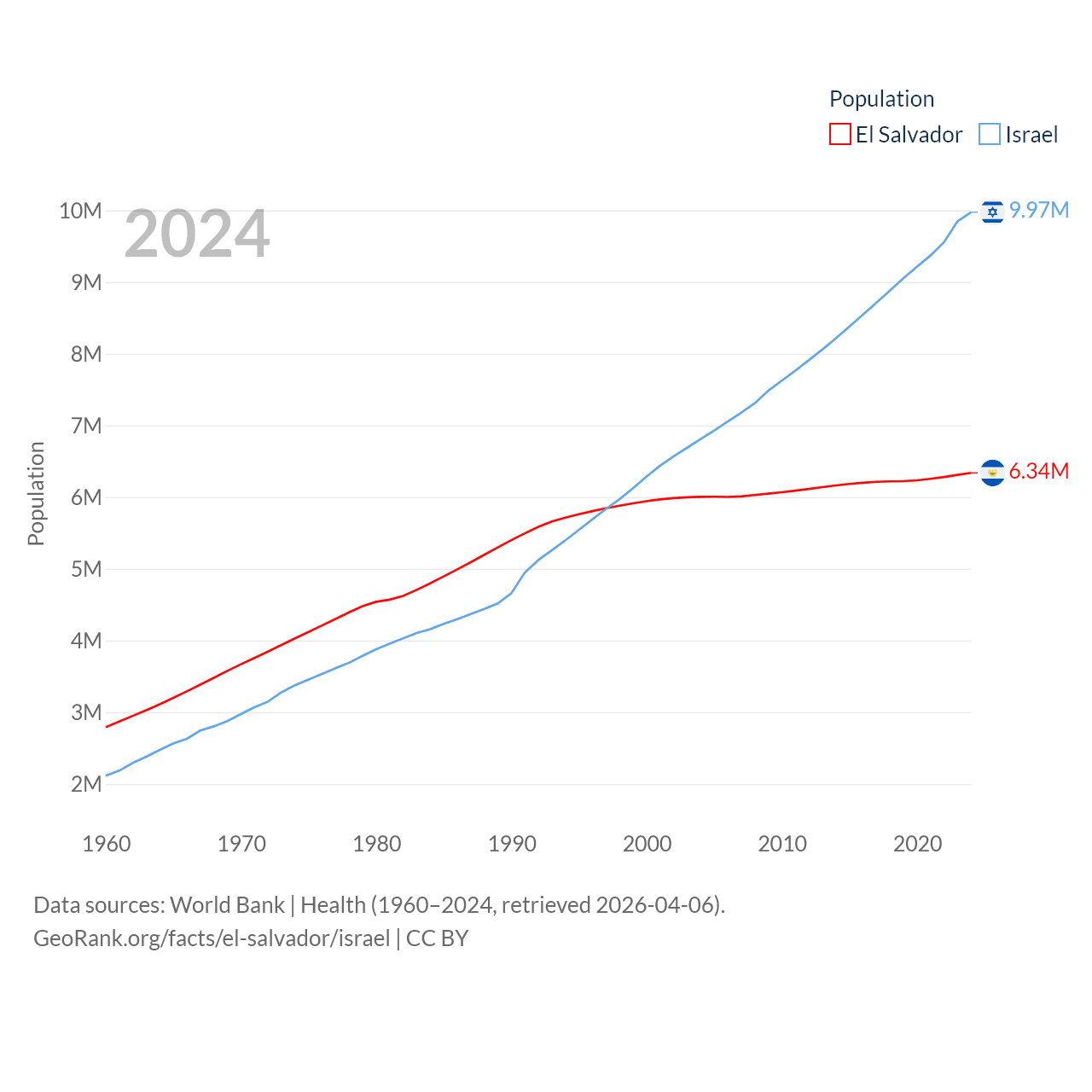 El Salvador has a population of 6.34M (ranked 111/197), compared with 9.97M in Israel (ranked 96/197). El Salvador's land area is 8,000 sq mi versus 8,355 sq mi for Israel (ranked 150th vs. 149th).