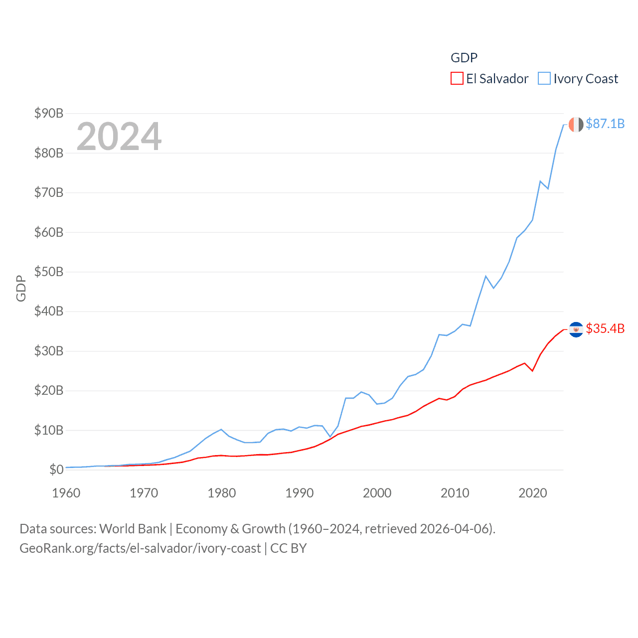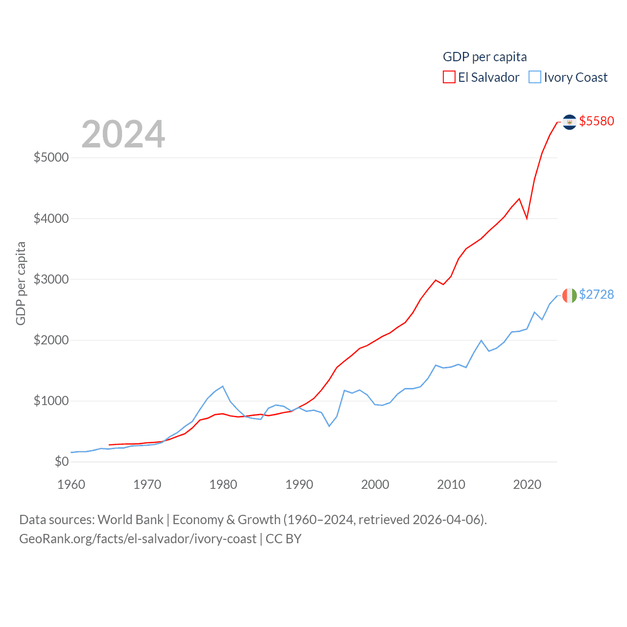 By GDP, El Salvador ranks 105/197 ($35.4B) and Ivory Coast ranks 77/197 ($87.1B). By GDP per capita, El Salvador ranks 116/197 ($5,580), while Ivory Coast ranks 142/197 ($2,728).