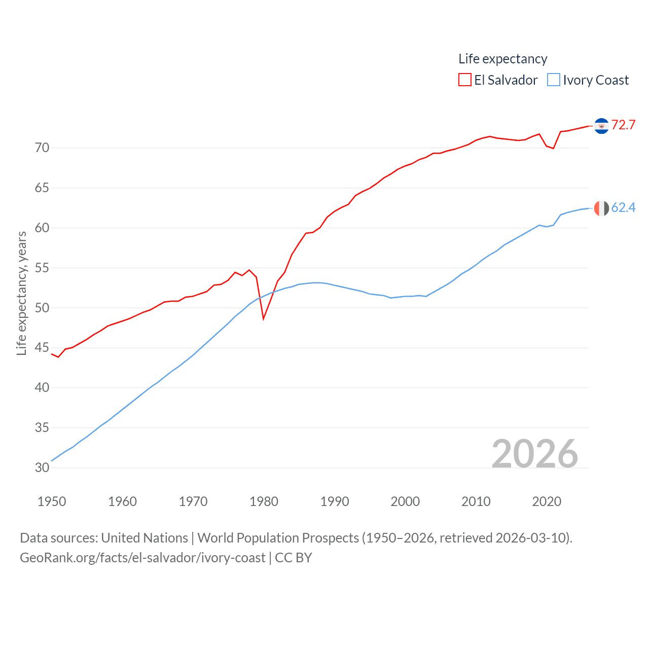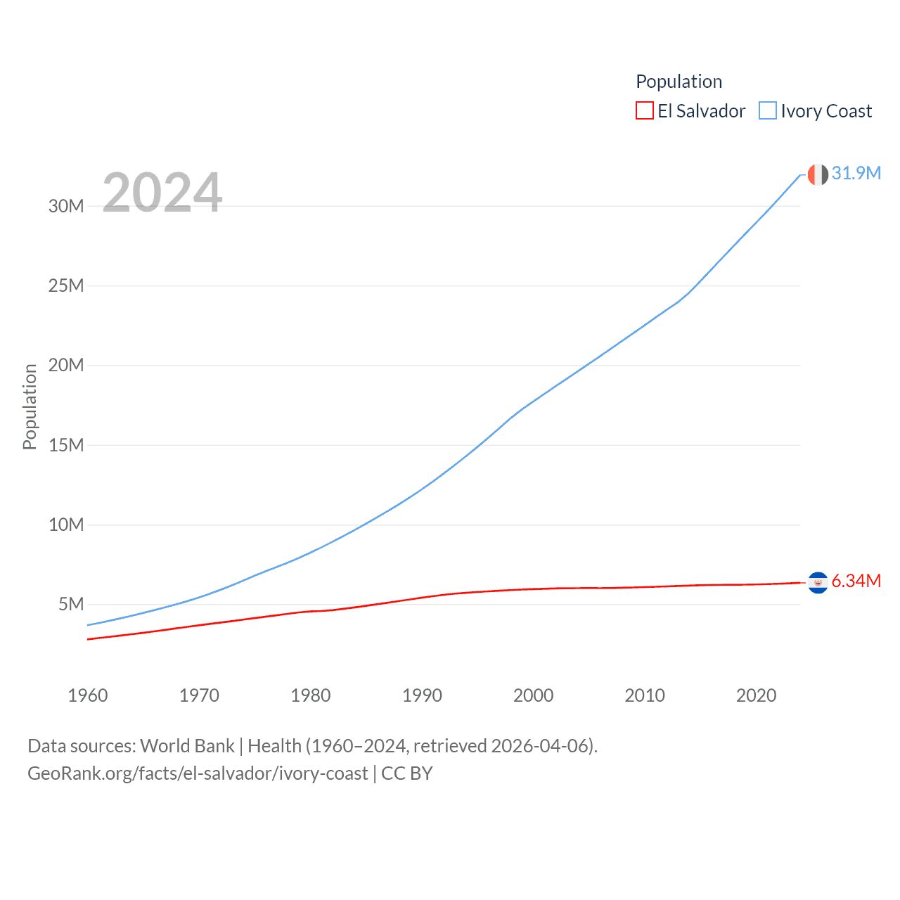El Salvador has a population of 6.34M (ranked 111/197), compared with 31.9M in Ivory Coast (ranked 50/197). El Salvador's land area is 8,000 sq mi versus 122,780 sq mi for Ivory Coast (ranked 150th vs. 66th).