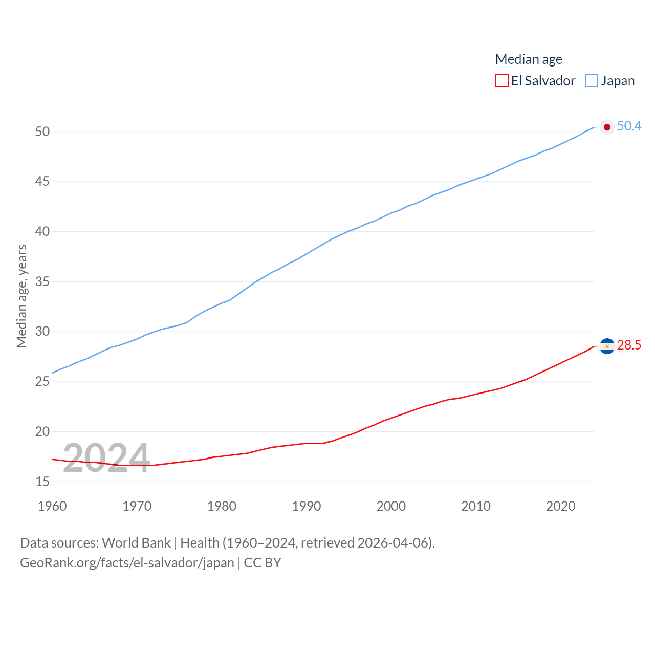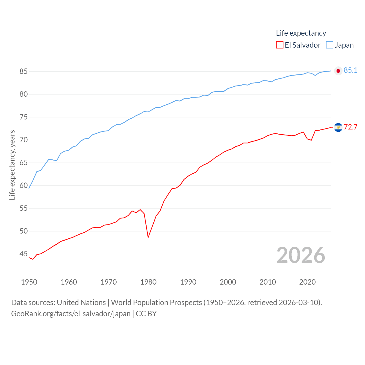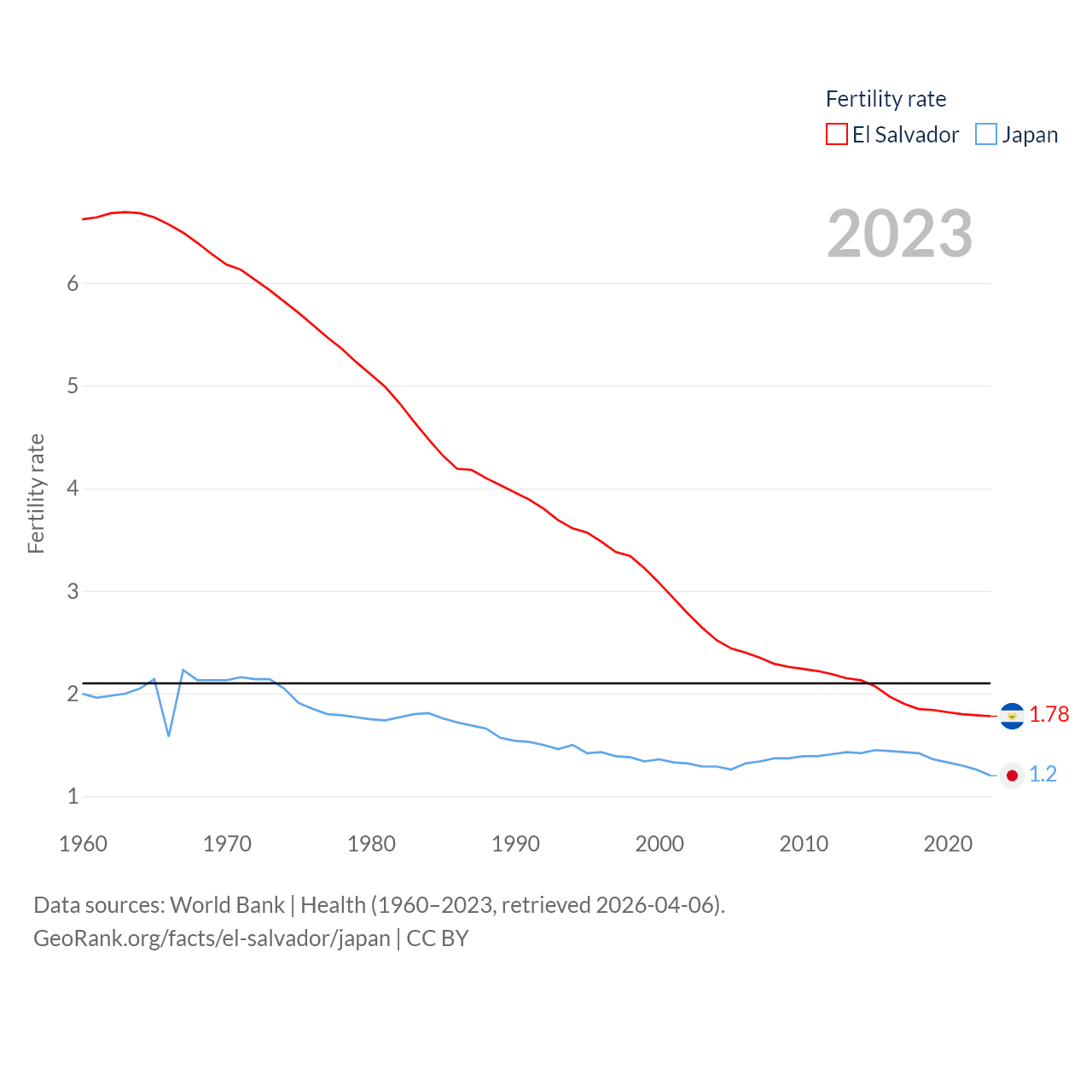 El Salvador has a population of 6.34M (ranked 111/197), compared with 124M in Japan (ranked 12/197). El Salvador's land area is 8,000 sq mi versus 140,761 sq mi for Japan (ranked 150th vs. 61st).