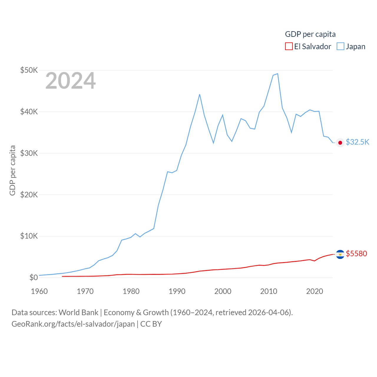 By GDP, El Salvador ranks 105/197 ($35.4B) and Japan ranks 4/197 ($4.03T). By GDP per capita, El Salvador ranks 116/197 ($5,580), while Japan ranks 38/197 ($32,487).
