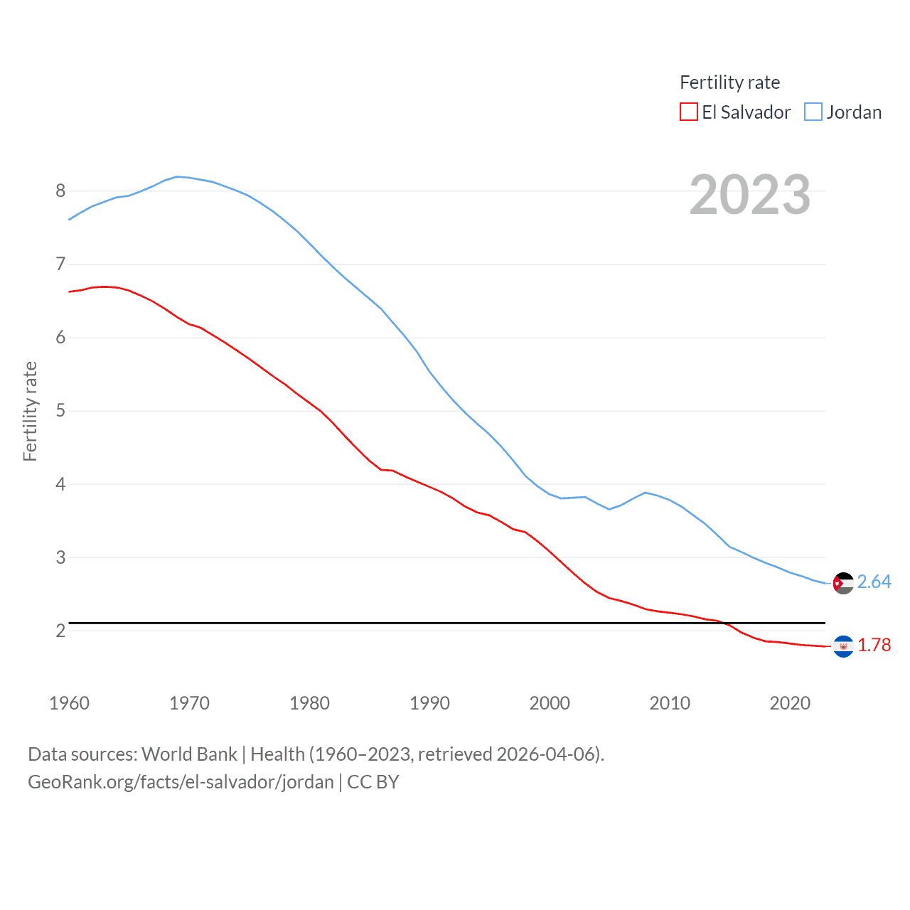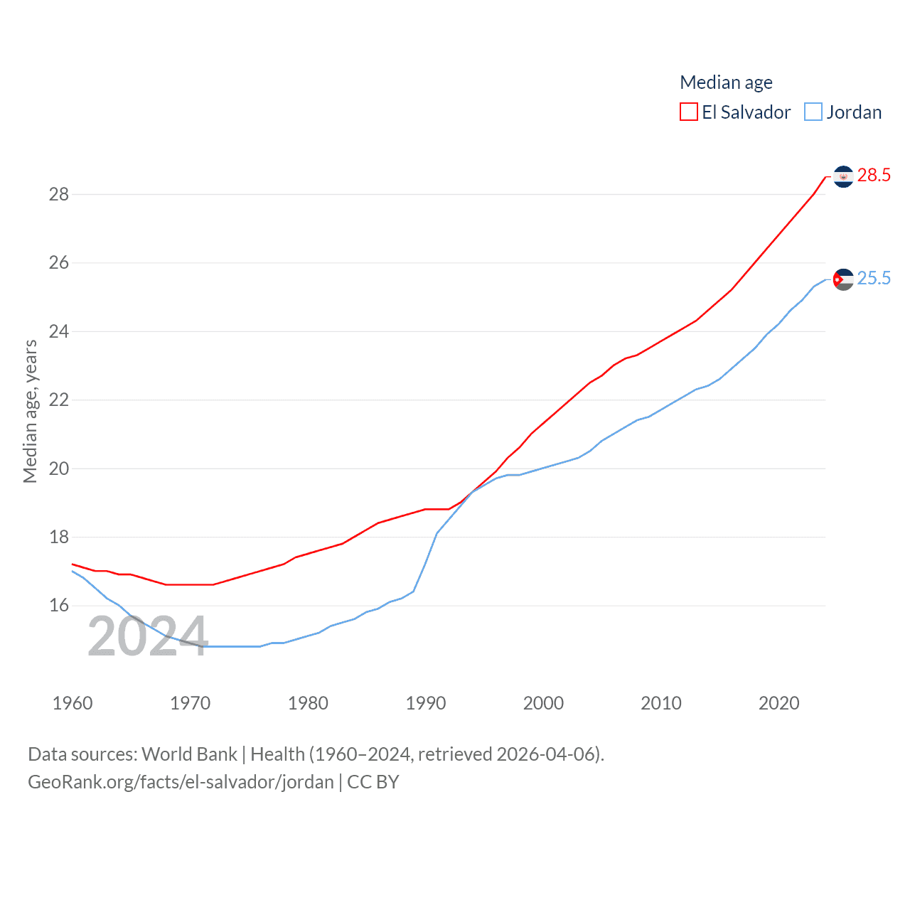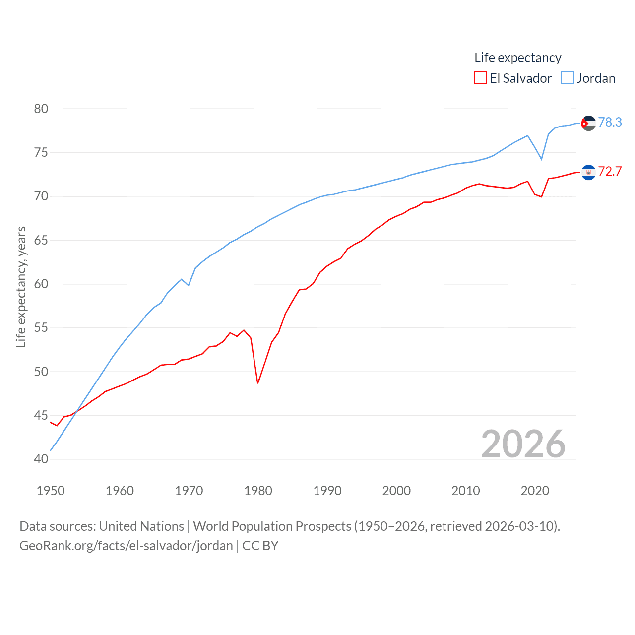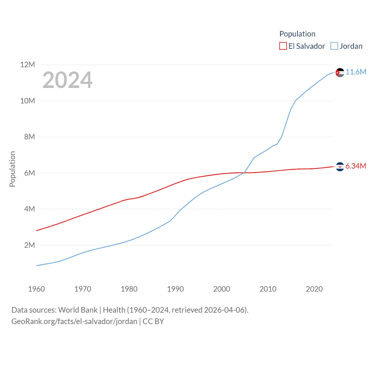 El Salvador has a population of 6.34M (ranked 111/197), compared with 11.6M in Jordan (ranked 84/197). El Salvador's land area is 8,000 sq mi versus 34,284 sq mi for Jordan (ranked 150th vs. 110th).