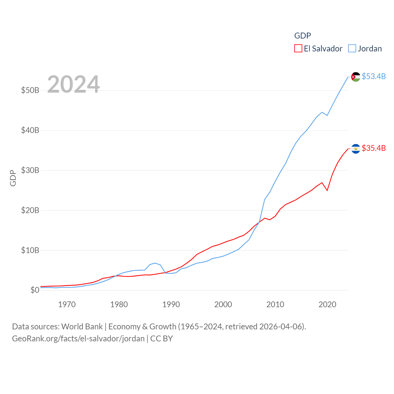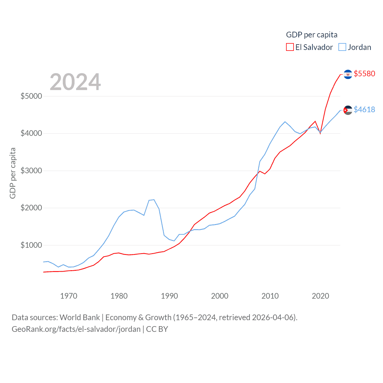 By GDP, El Salvador ranks 105/197 ($35.4B) and Jordan ranks 90/197 ($53.4B). By GDP per capita, El Salvador ranks 116/197 ($5,580), while Jordan ranks 123/197 ($4,618).