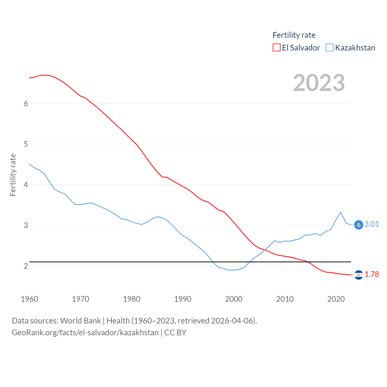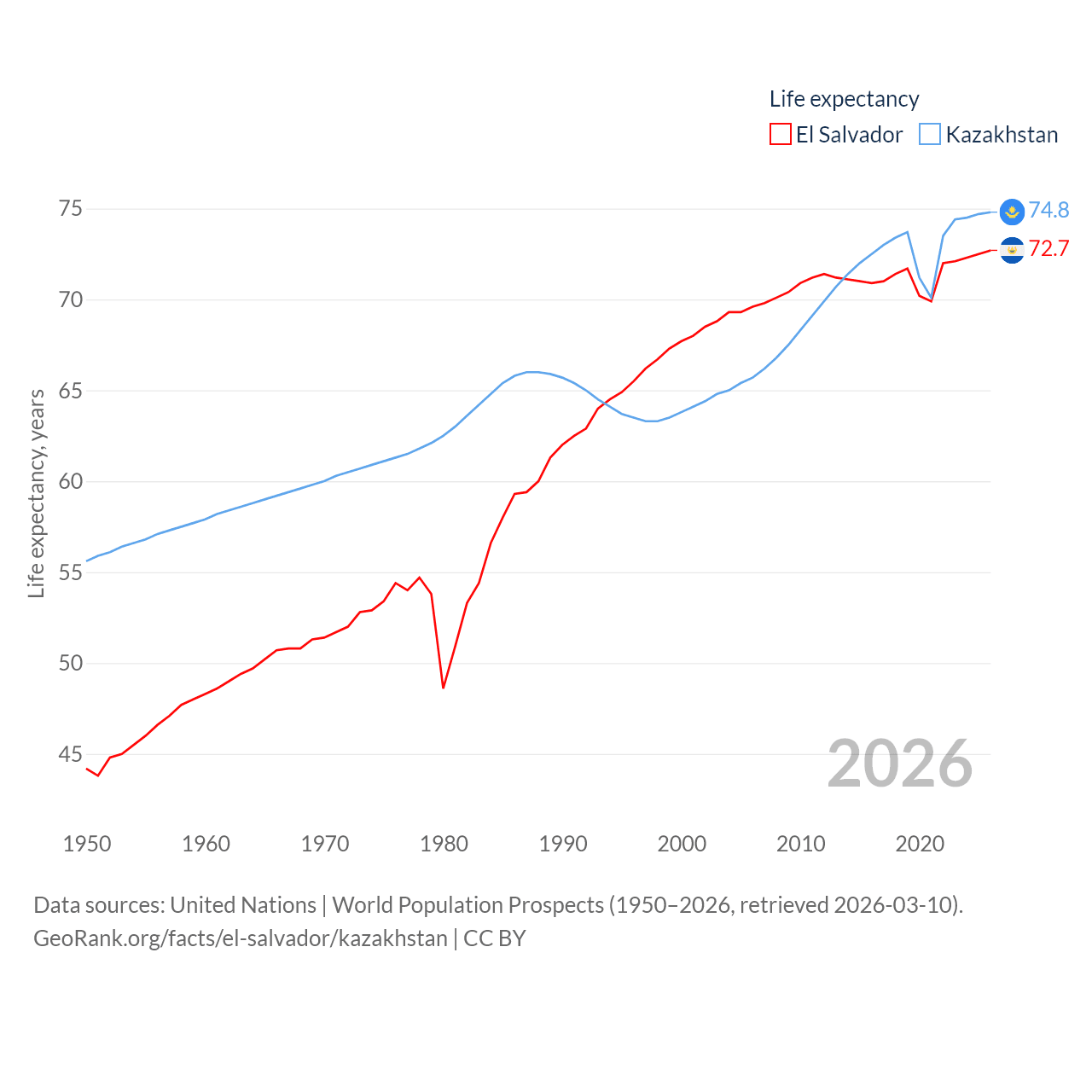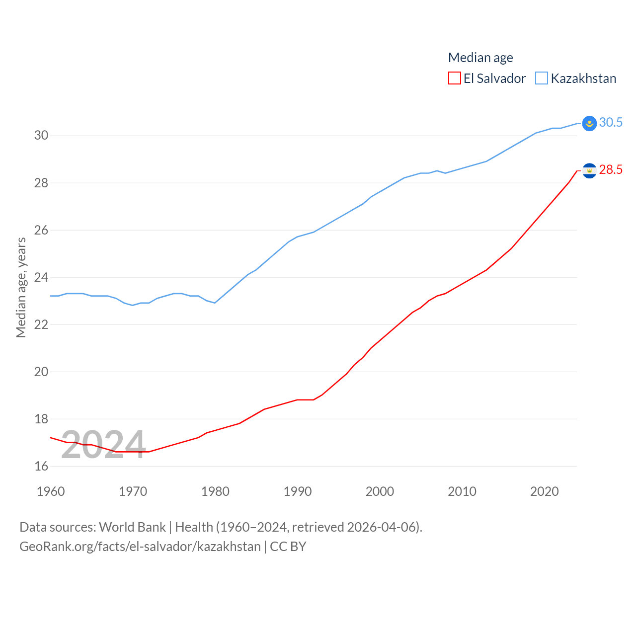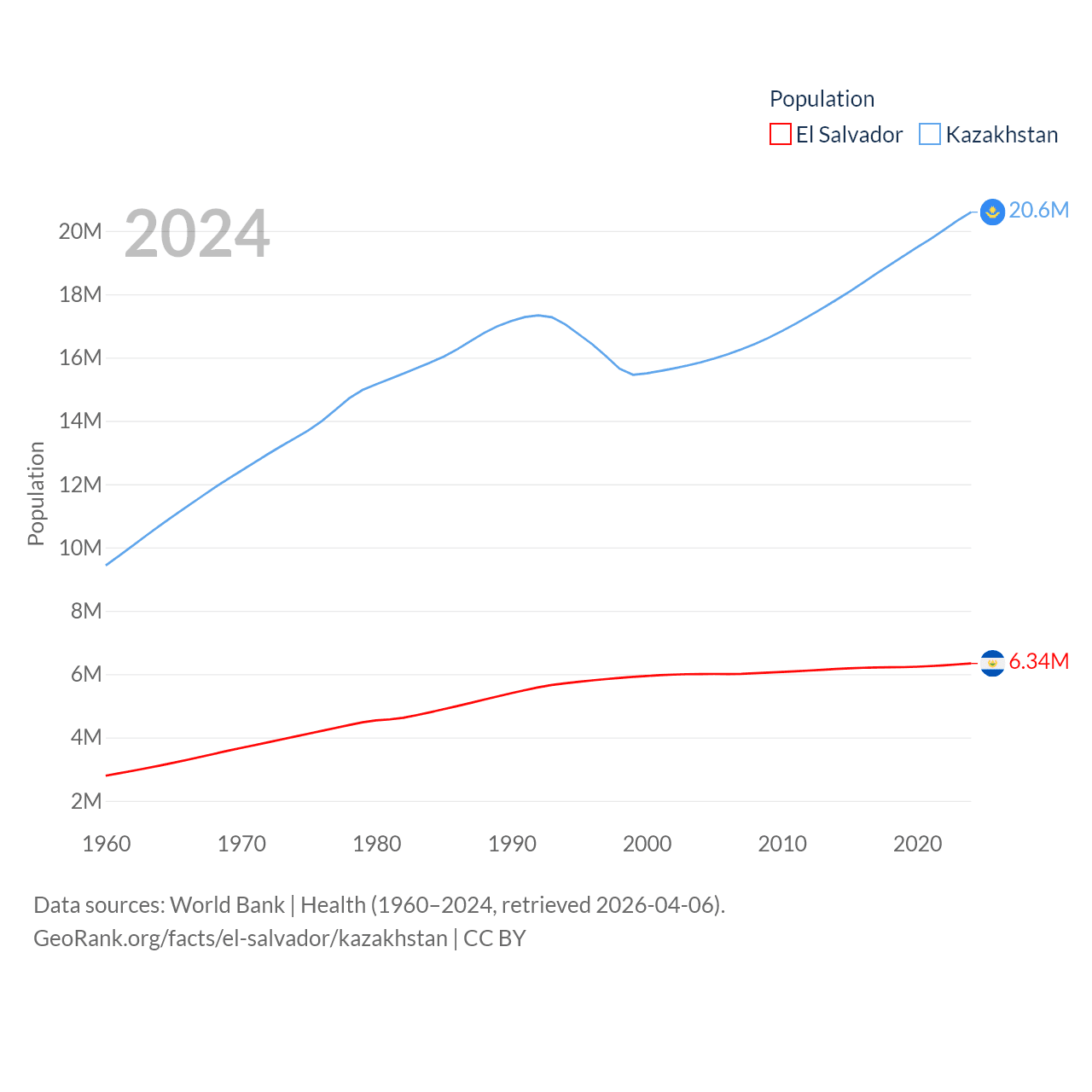 El Salvador has a population of 6.34M (ranked 111/197), compared with 20.6M in Kazakhstan (ranked 64/197). El Salvador's land area is 8,000 sq mi versus 1,042,360 sq mi for Kazakhstan (ranked 150th vs. 9th).