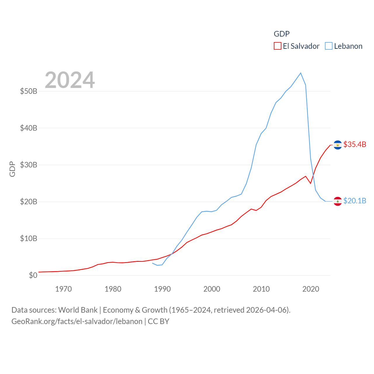 By GDP, El Salvador ranks 105/197 ($35.4B) and Lebanon ranks 128/197 ($20.1B). By GDP per capita, El Salvador ranks 116/197 ($5,580), while Lebanon ranks 135/197 ($3,478).