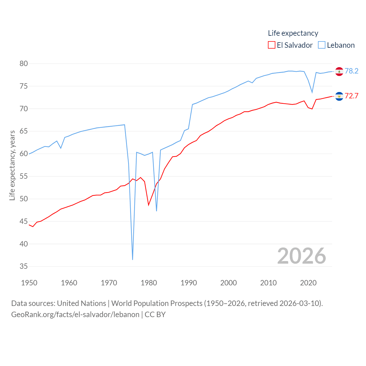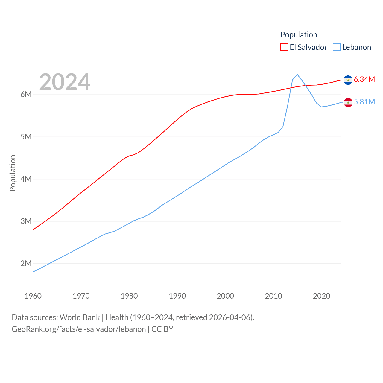 El Salvador has a population of 6.34M (ranked 111/197), compared with 5.81M in Lebanon (ranked 115/197). El Salvador's land area is 8,000 sq mi versus 3,950 sq mi for Lebanon (ranked 150th vs. 160th).