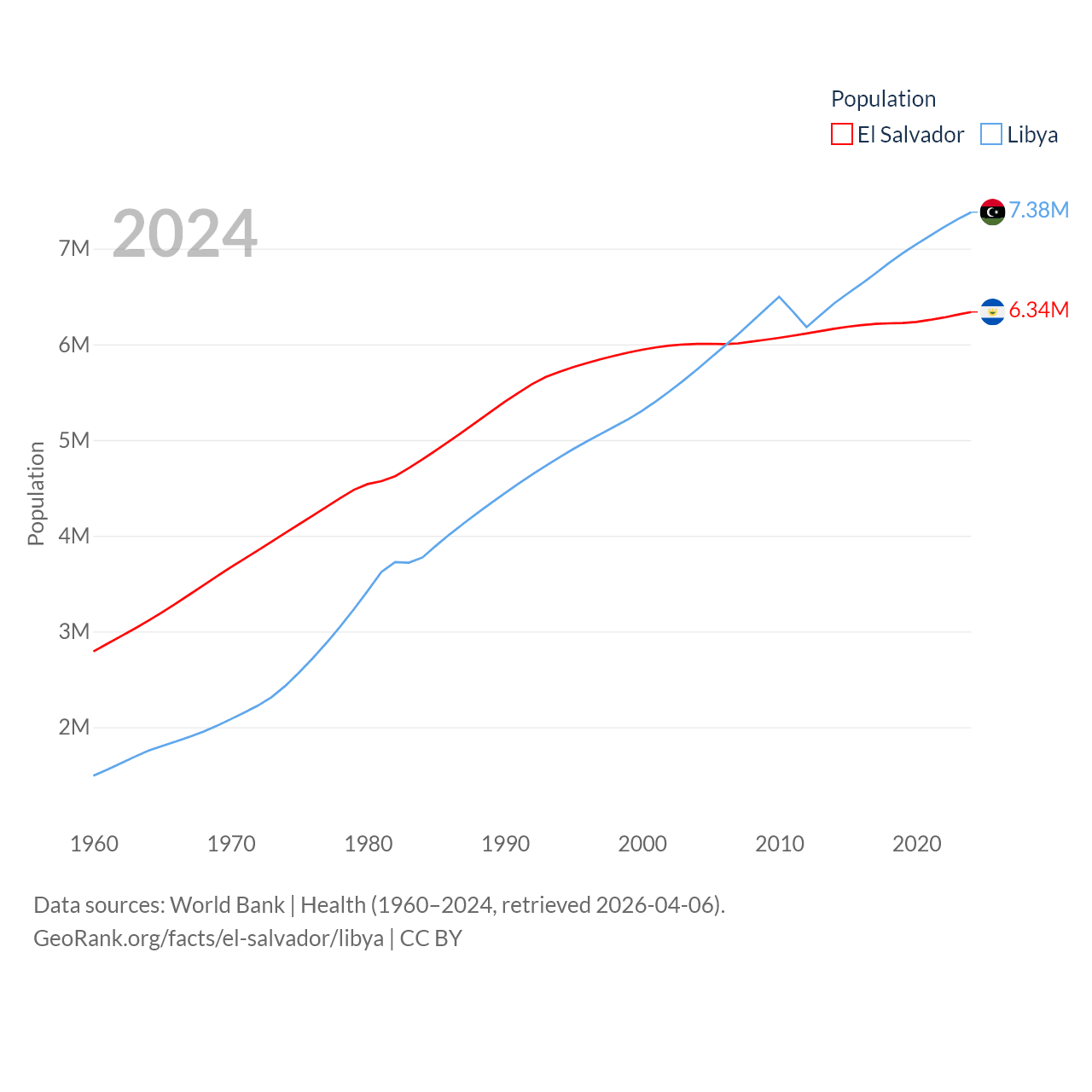 El Salvador has a population of 6.34M (ranked 111/197), compared with 7.38M in Libya (ranked 105/197). El Salvador's land area is 8,000 sq mi versus 679,362 sq mi for Libya (ranked 150th vs. 16th).