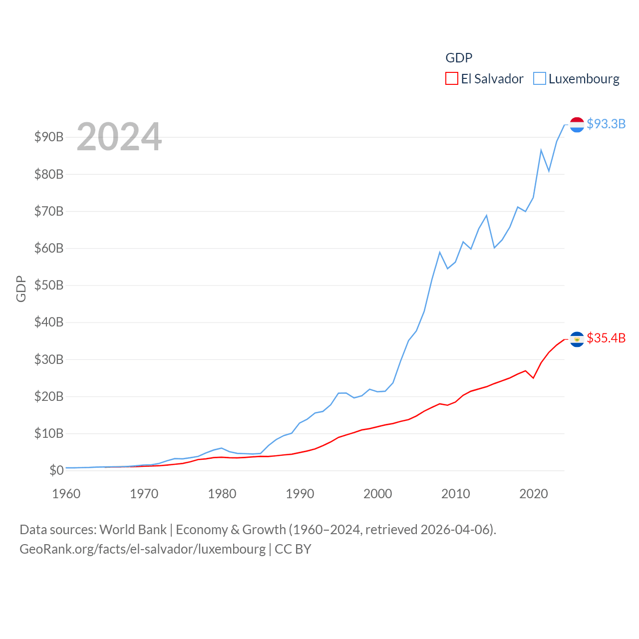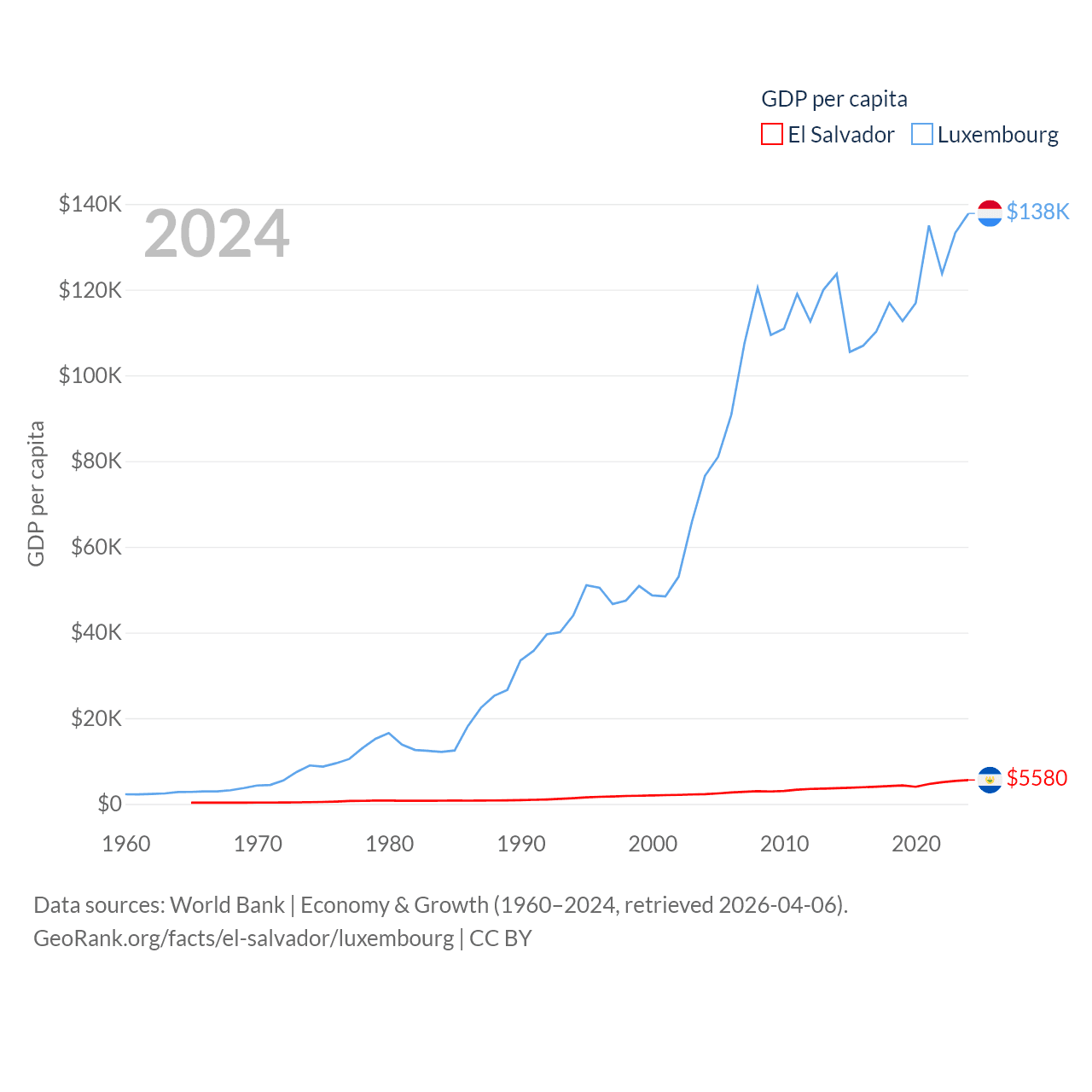 By GDP, El Salvador ranks 105/197 ($35.4B) and Luxembourg ranks 74/197 ($93.3B). By GDP per capita, El Salvador ranks 116/197 ($5,580), while Luxembourg ranks 3/197 ($137,782).