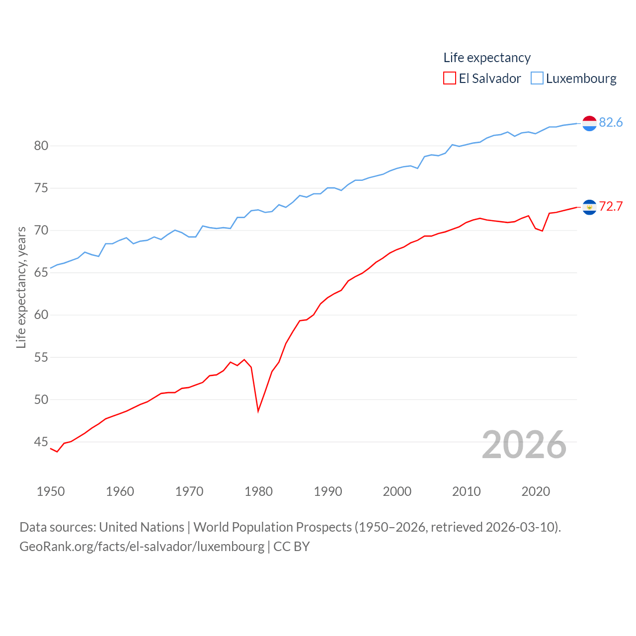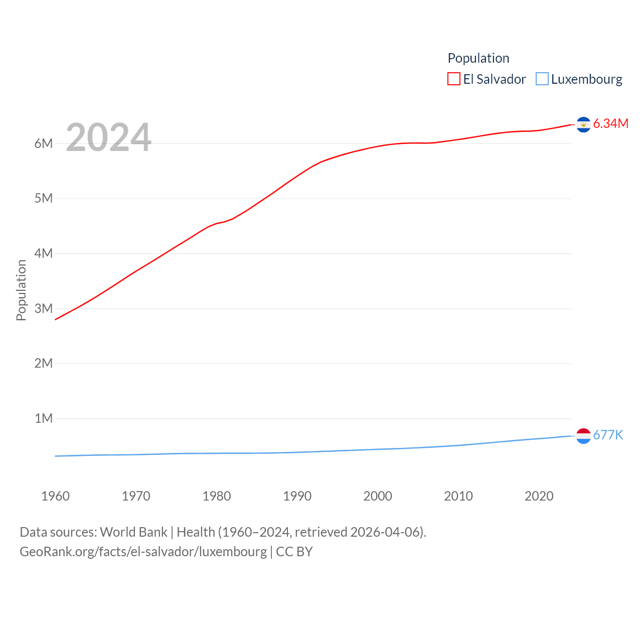 El Salvador has a population of 6.34M (ranked 111/197), compared with 677K in Luxembourg (ranked 164/197). El Salvador's land area is 8,000 sq mi versus 994 sq mi for Luxembourg (ranked 150th vs. 169th).