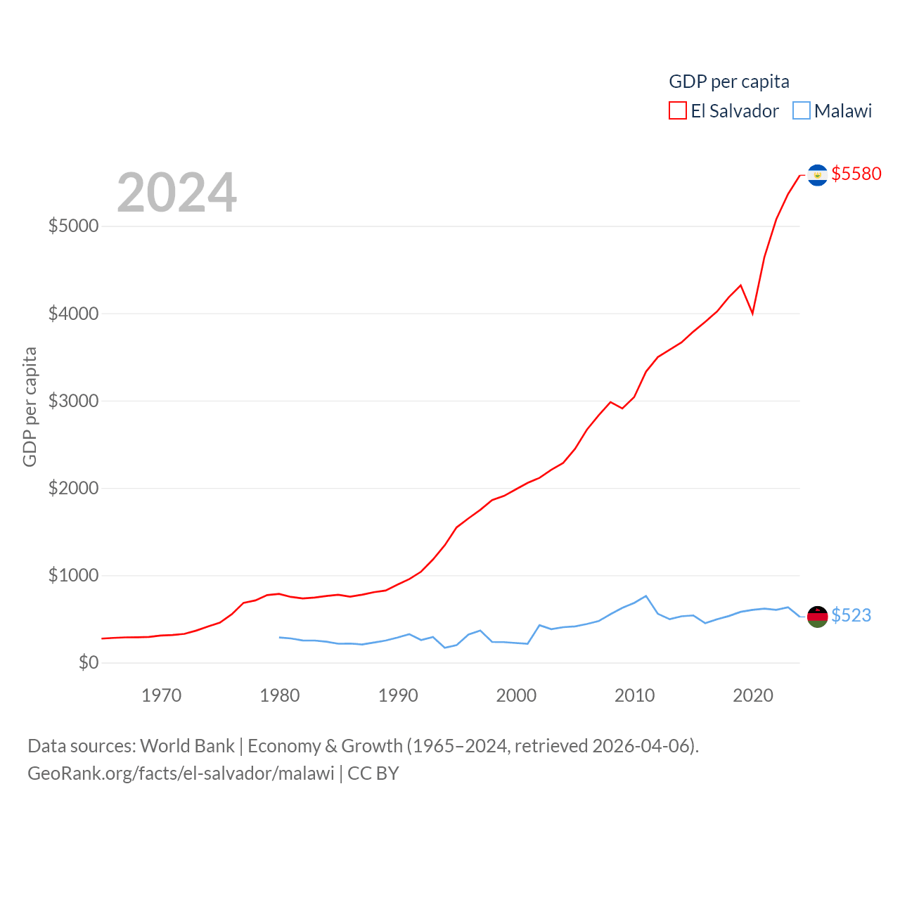By GDP, El Salvador ranks 105/197 ($35.4B) and Malawi ranks 151/197 ($11.3B). By GDP per capita, El Salvador ranks 116/197 ($5,580), while Malawi ranks 194/197 ($523).