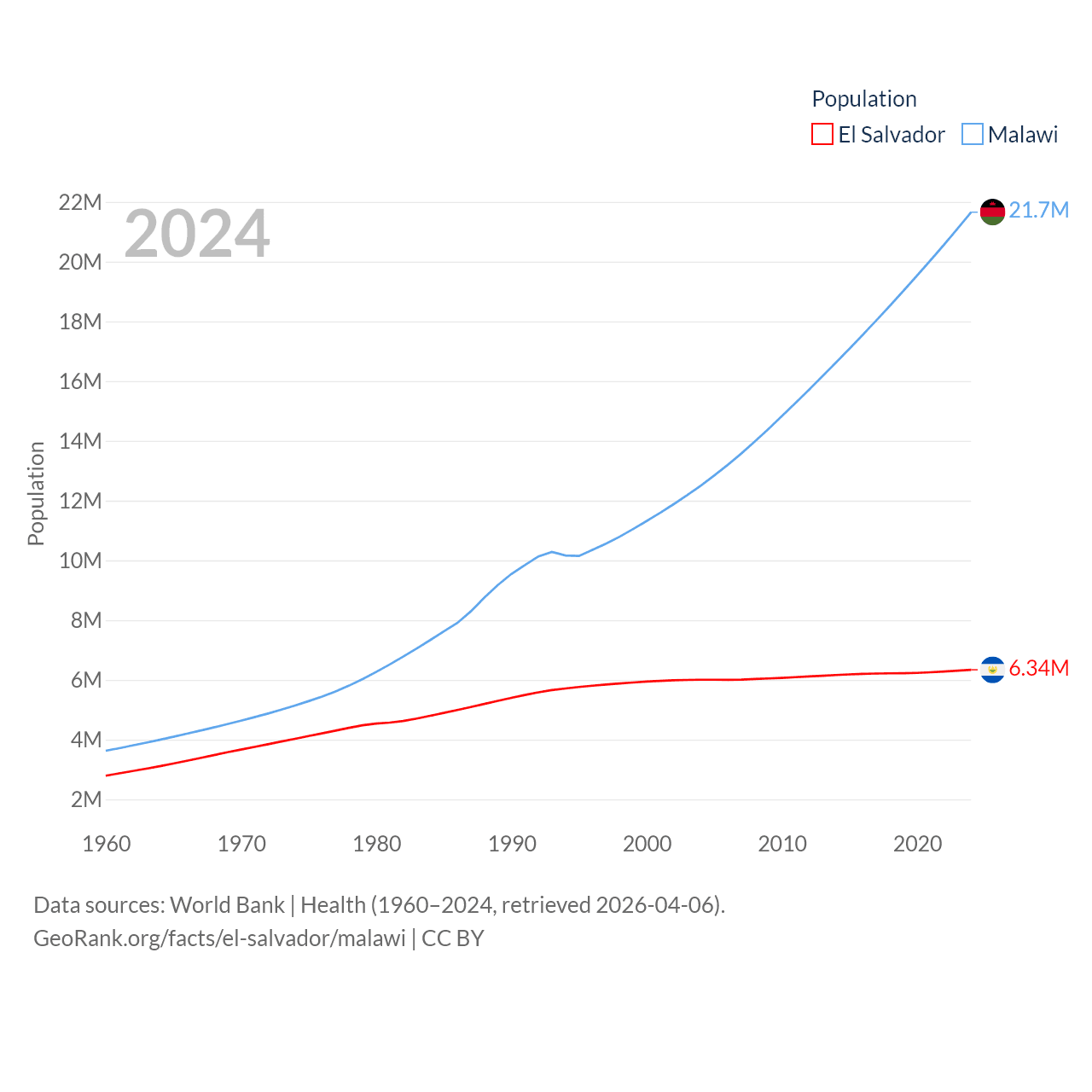 El Salvador has a population of 6.34M (ranked 111/197), compared with 21.7M in Malawi (ranked 62/197). El Salvador's land area is 8,000 sq mi versus 36,402 sq mi for Malawi (ranked 150th vs. 107th).