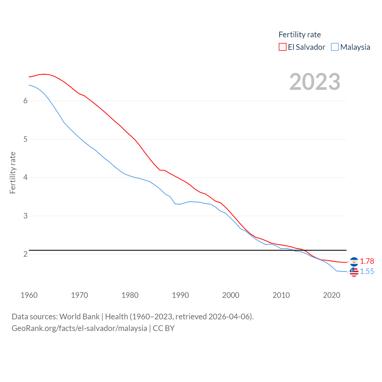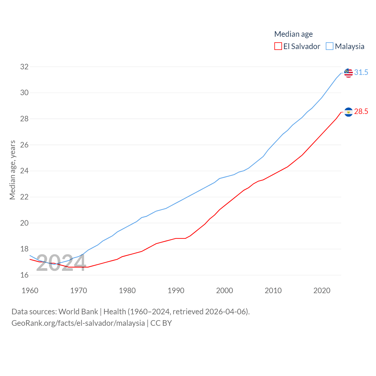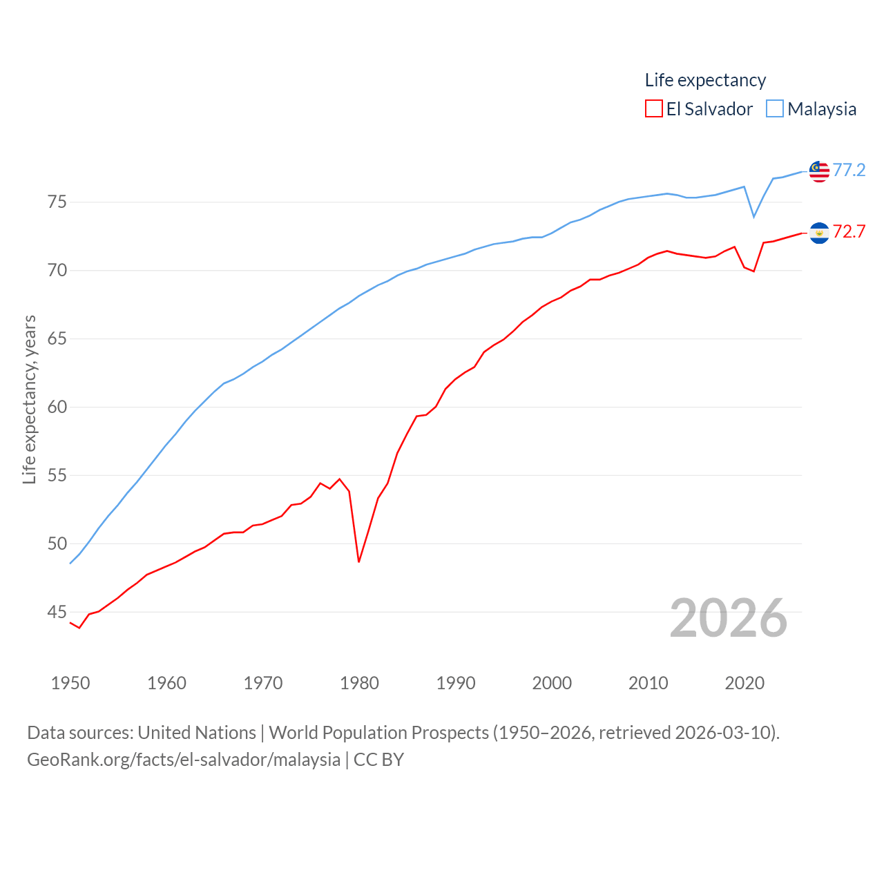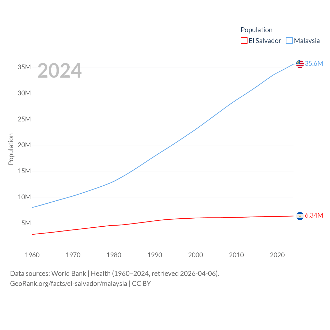 El Salvador has a population of 6.34M (ranked 111/197), compared with 35.6M in Malaysia (ranked 44/197). El Salvador's land area is 8,000 sq mi versus 126,854 sq mi for Malaysia (ranked 150th vs. 65th).