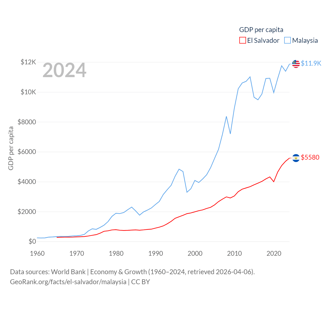 By GDP, El Salvador ranks 105/197 ($35.4B) and Malaysia ranks 38/197 ($422B). By GDP per capita, El Salvador ranks 116/197 ($5,580), while Malaysia ranks 79/197 ($11,874).