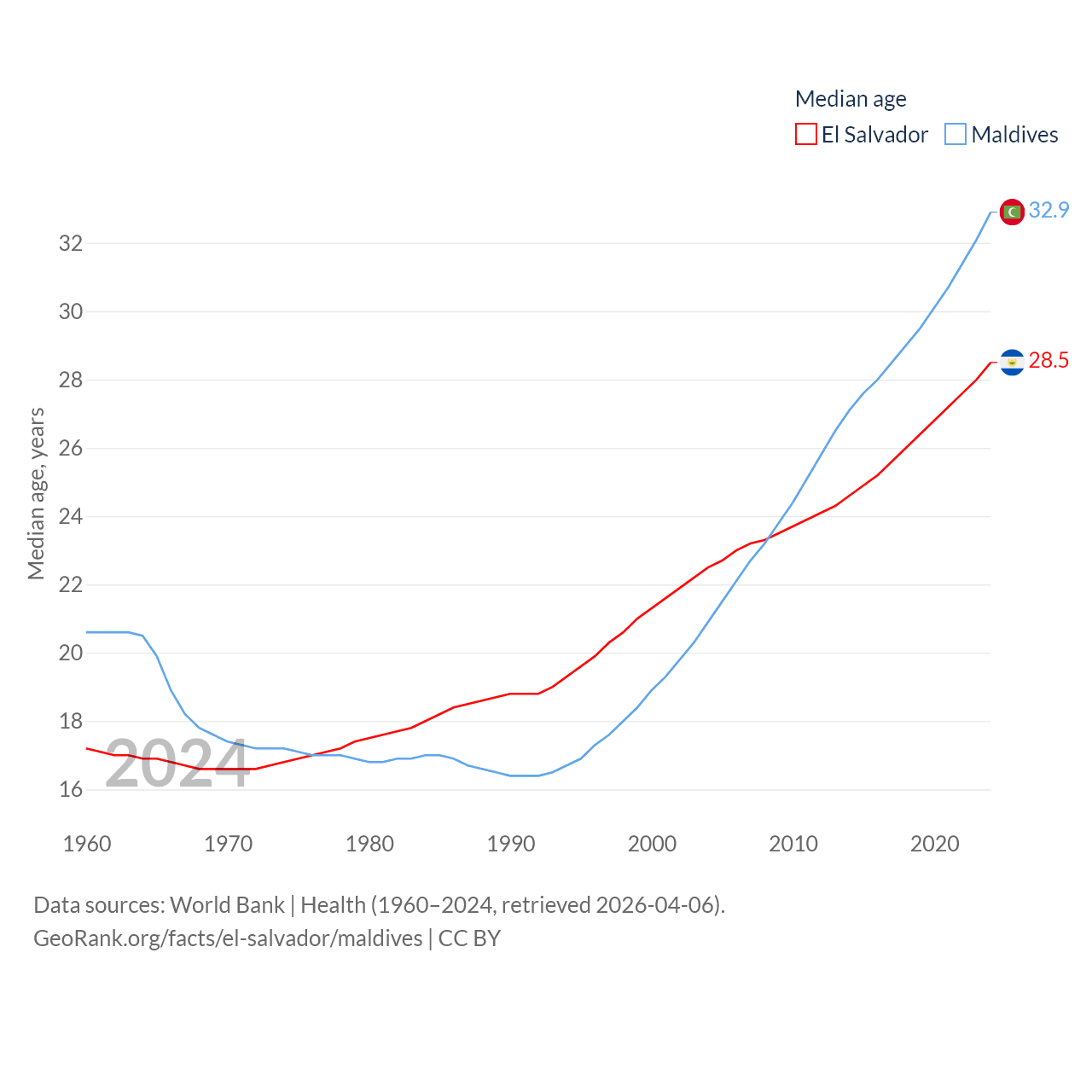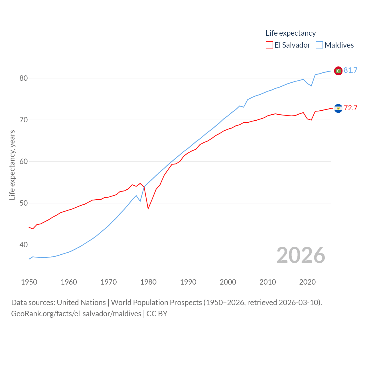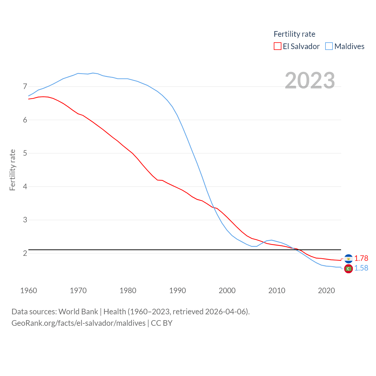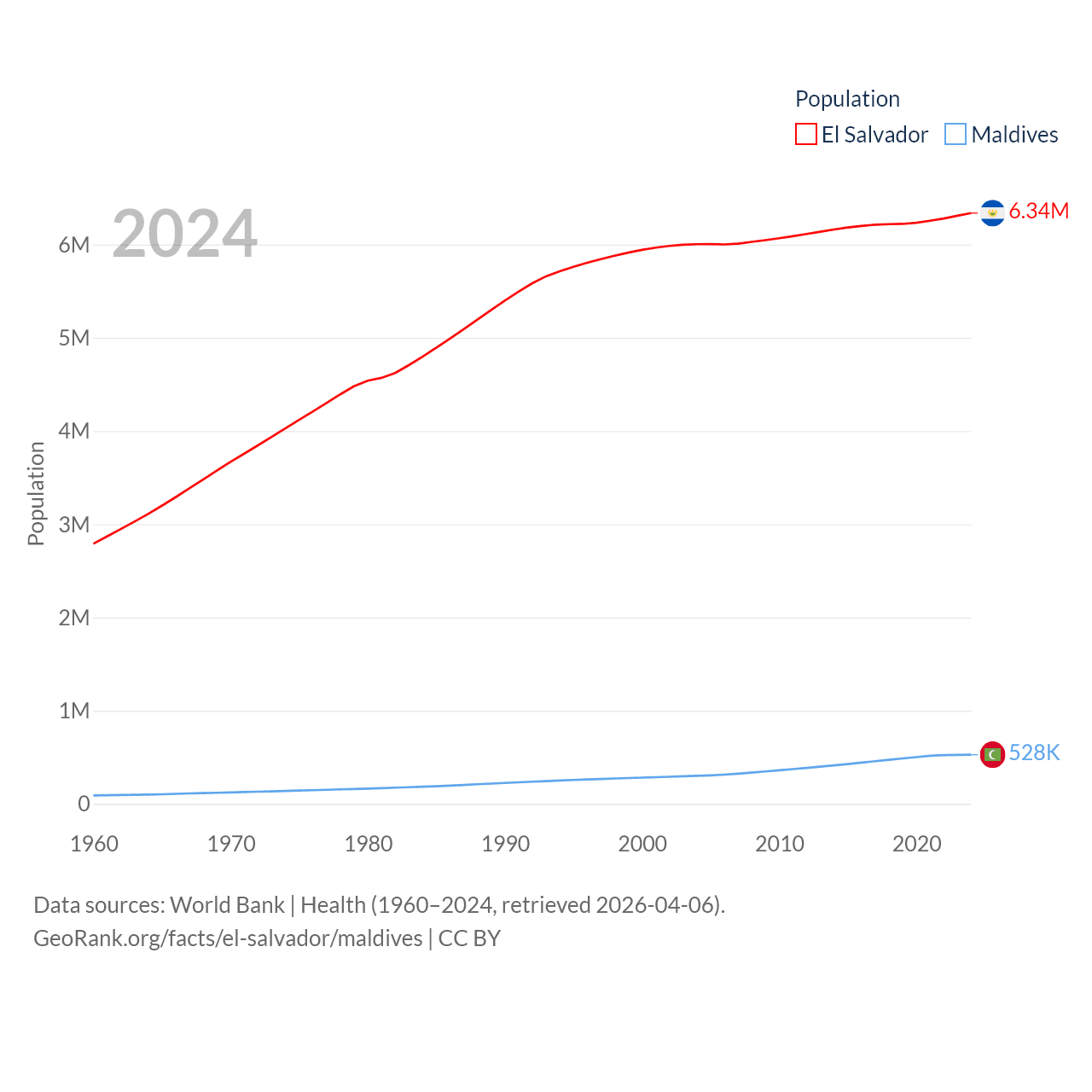 El Salvador has a population of 6.34M (ranked 111/197), compared with 528K in Maldives (ranked 168/197). El Salvador's land area is 8,000 sq mi versus 115.1 sq mi for Maldives (ranked 150th vs. 188th).