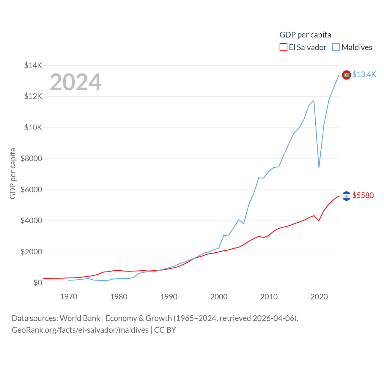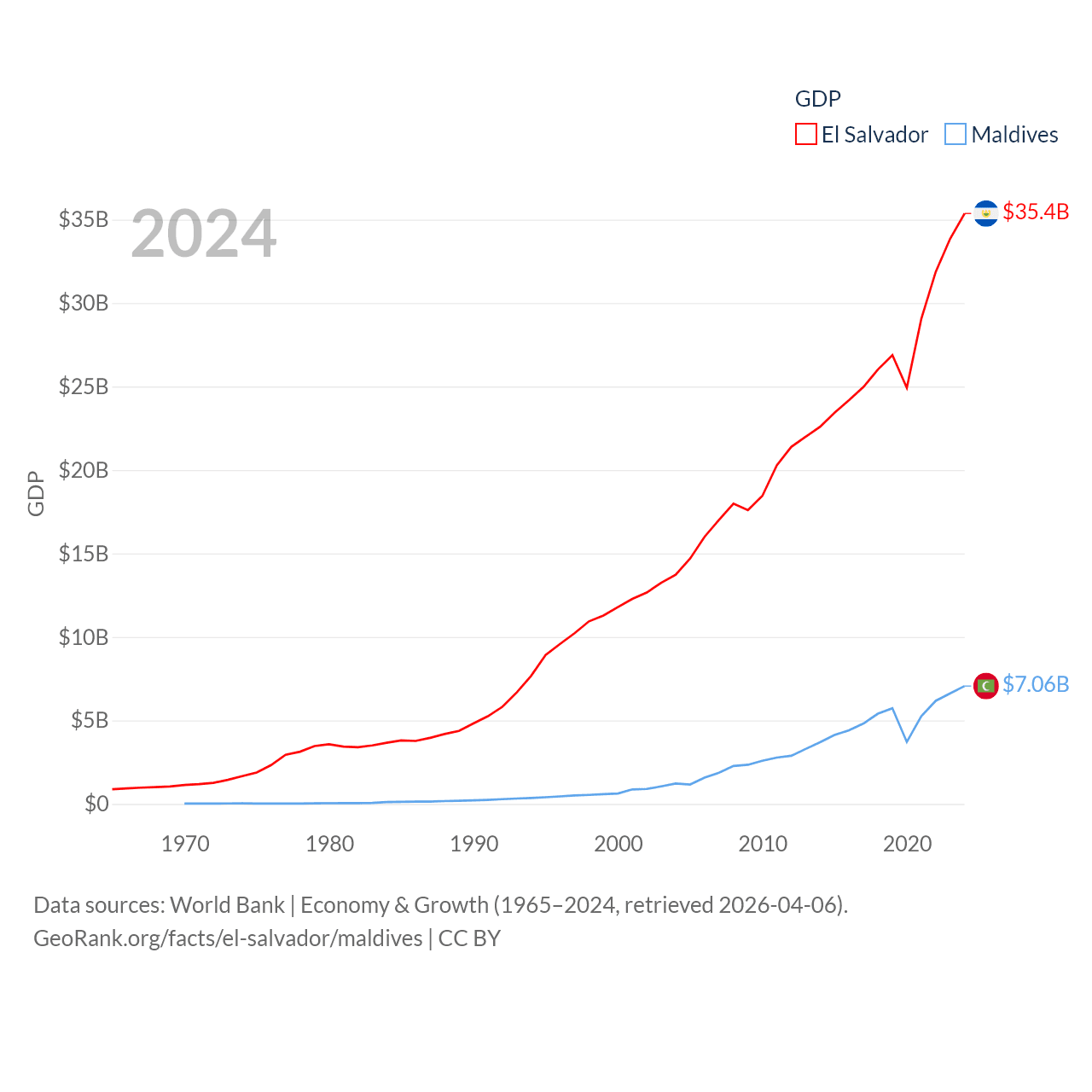 By GDP, El Salvador ranks 105/197 ($35.4B) and Maldives ranks 159/197 ($7.06B). By GDP per capita, El Salvador ranks 116/197 ($5,580), while Maldives ranks 75/197 ($13,379).