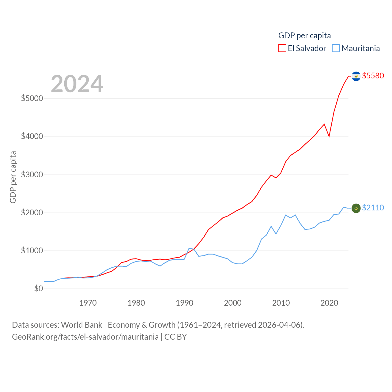 By GDP, El Salvador ranks 105/197 ($35.4B) and Mauritania ranks 153/197 ($10.9B). By GDP per capita, El Salvador ranks 116/197 ($5,580), while Mauritania ranks 156/197 ($2,110).
