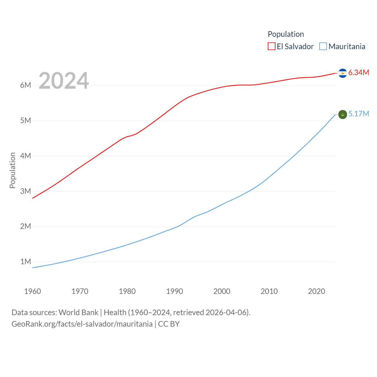 El Salvador has a population of 6.34M (ranked 111/197), compared with 5.17M in Mauritania (ranked 125/197). El Salvador's land area is 8,000 sq mi versus 397,955 sq mi for Mauritania (ranked 150th vs. 28th).