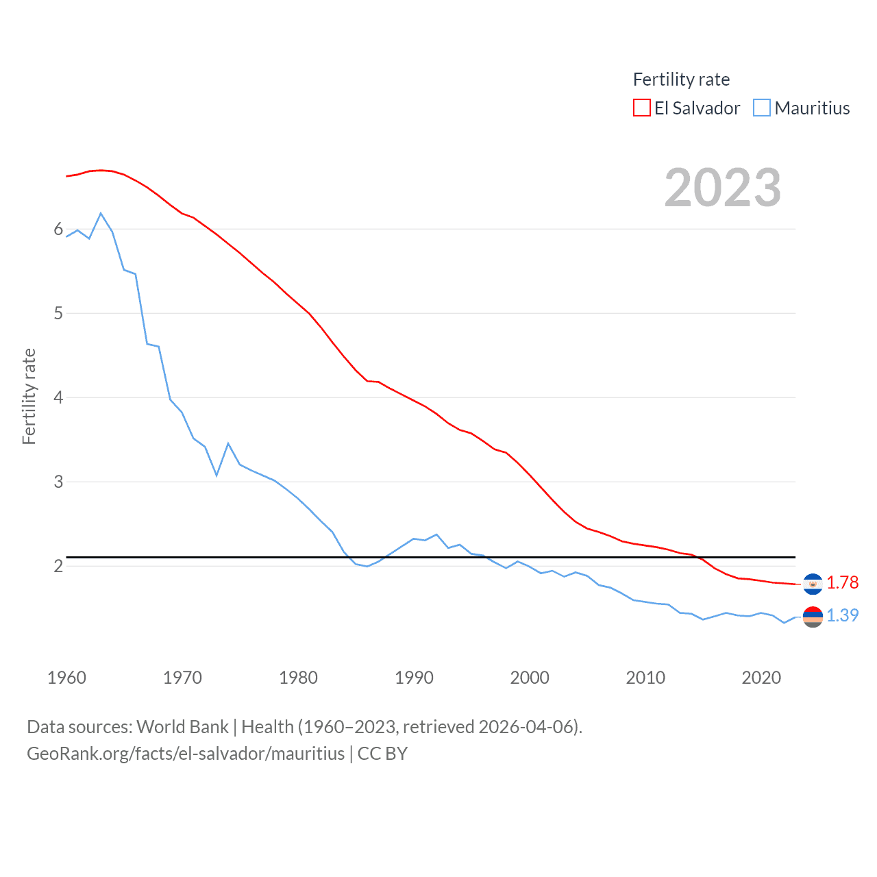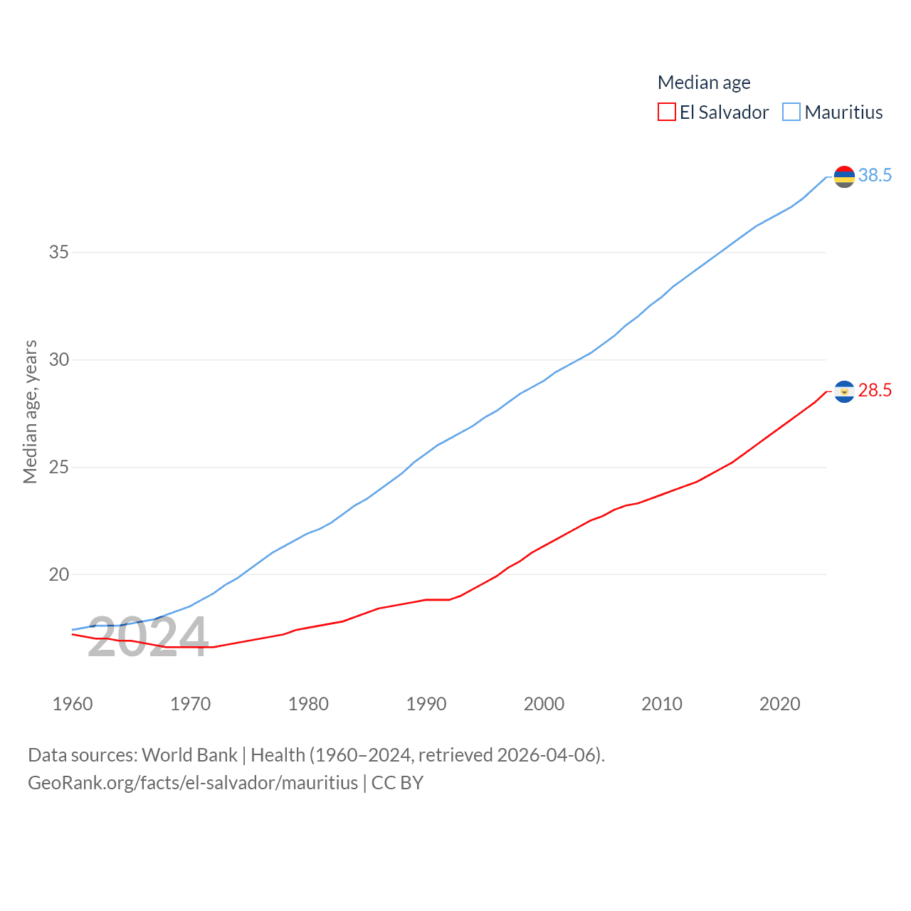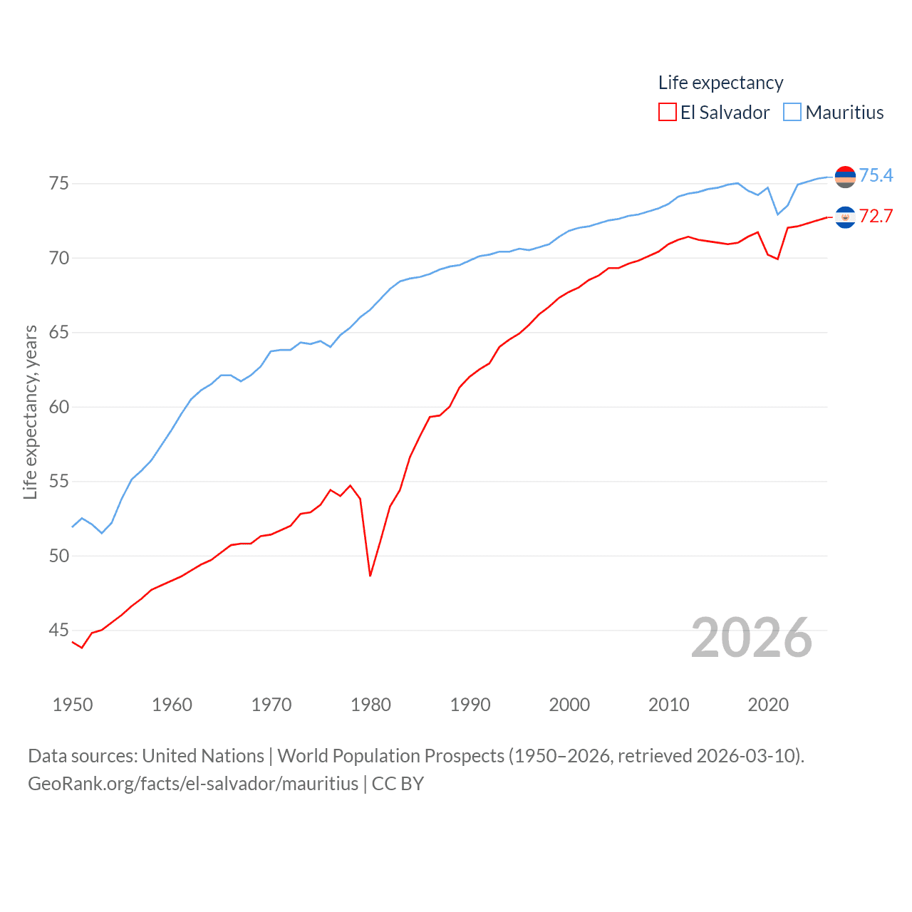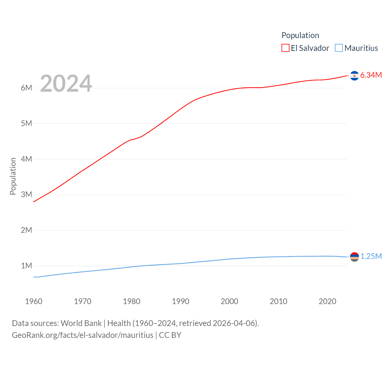 El Salvador has a population of 6.34M (ranked 111/197), compared with 1.25M in Mauritius (ranked 156/197). El Salvador's land area is 8,000 sq mi versus 771 sq mi for Mauritius (ranked 150th vs. 170th).