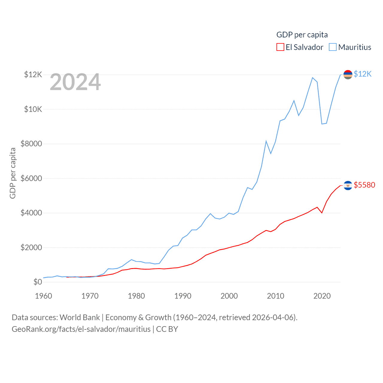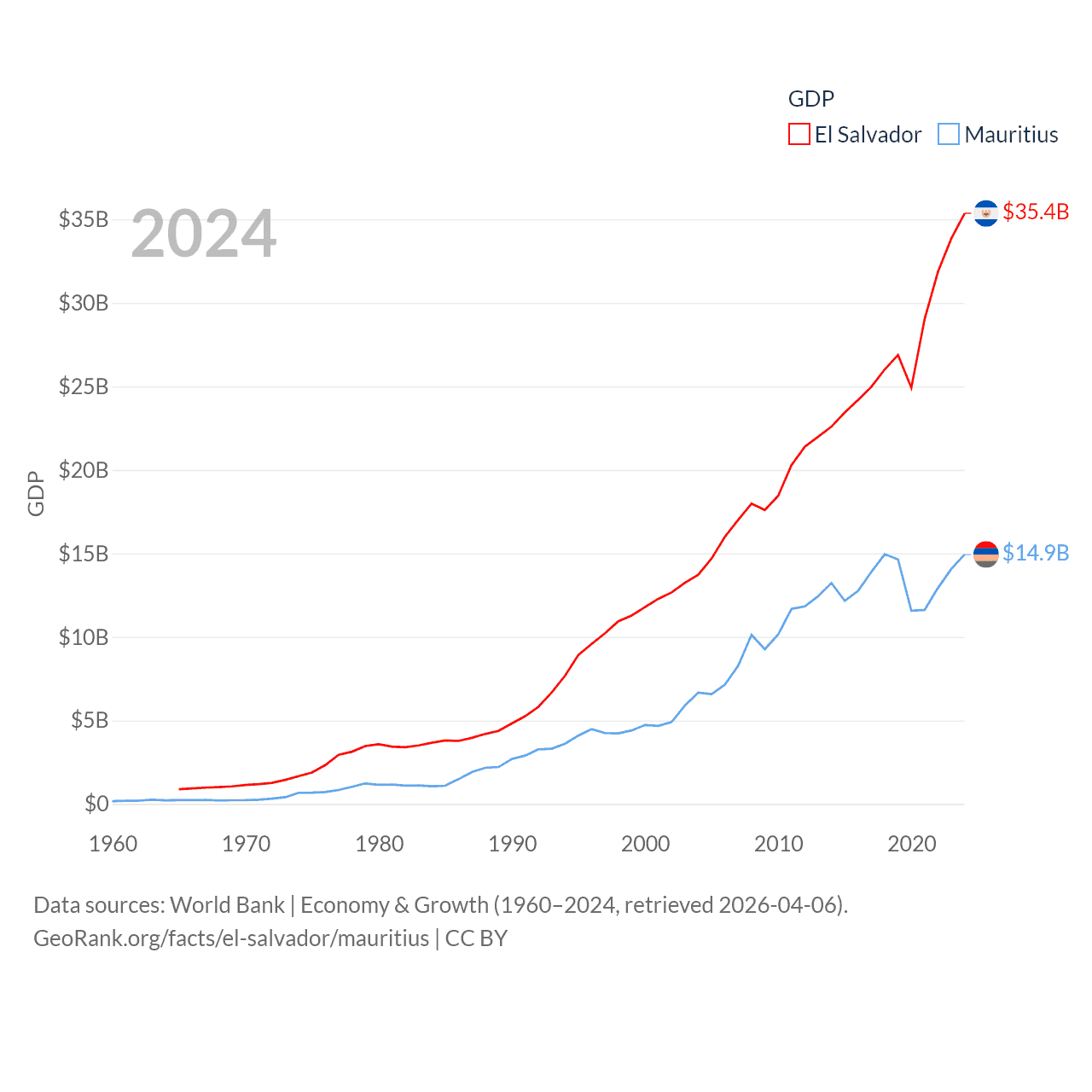 By GDP, El Salvador ranks 105/197 ($35.4B) and Mauritius ranks 143/197 ($14.9B). By GDP per capita, El Salvador ranks 116/197 ($5,580), while Mauritius ranks 78/197 ($11,991).