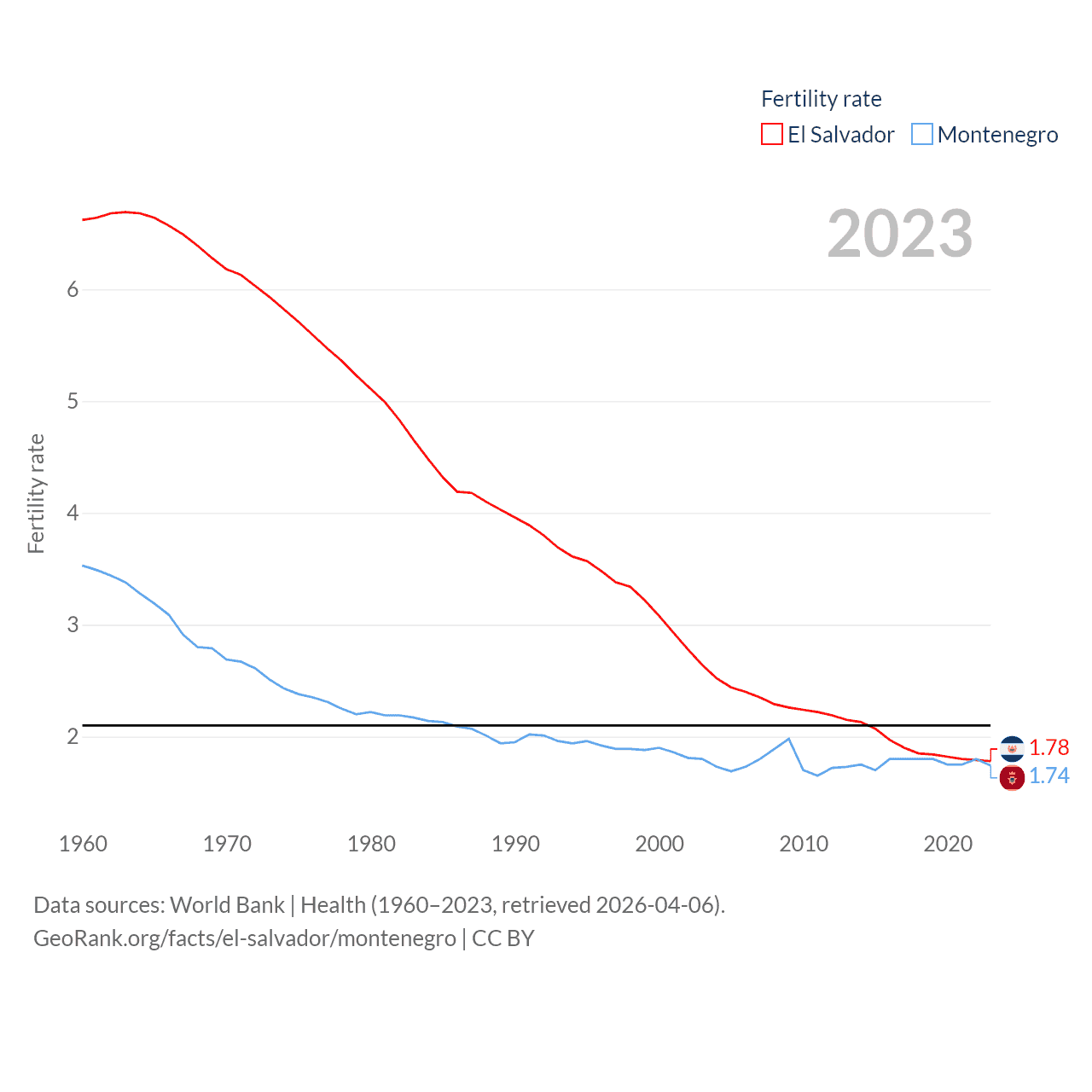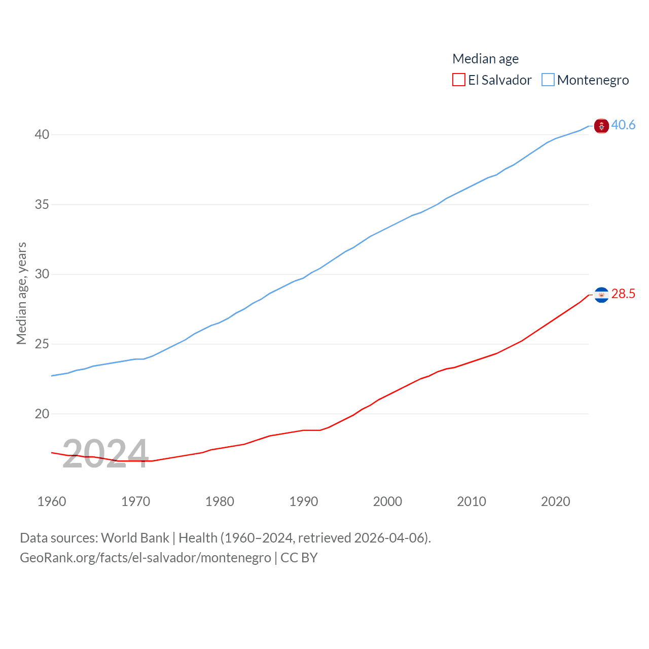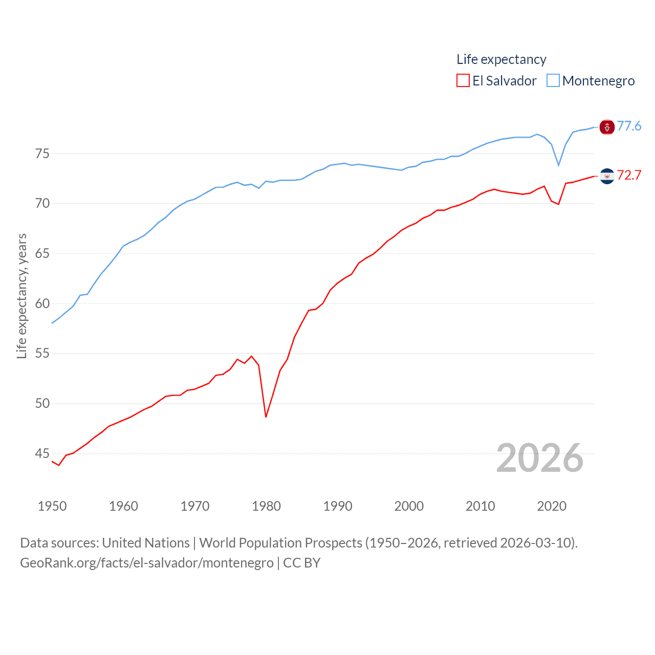 El Salvador has a population of 6.34M (ranked 111/197), compared with 624K in Montenegro (ranked 166/197). El Salvador's land area is 8,000 sq mi versus 5,193 sq mi for Montenegro (ranked 150th vs. 156th).