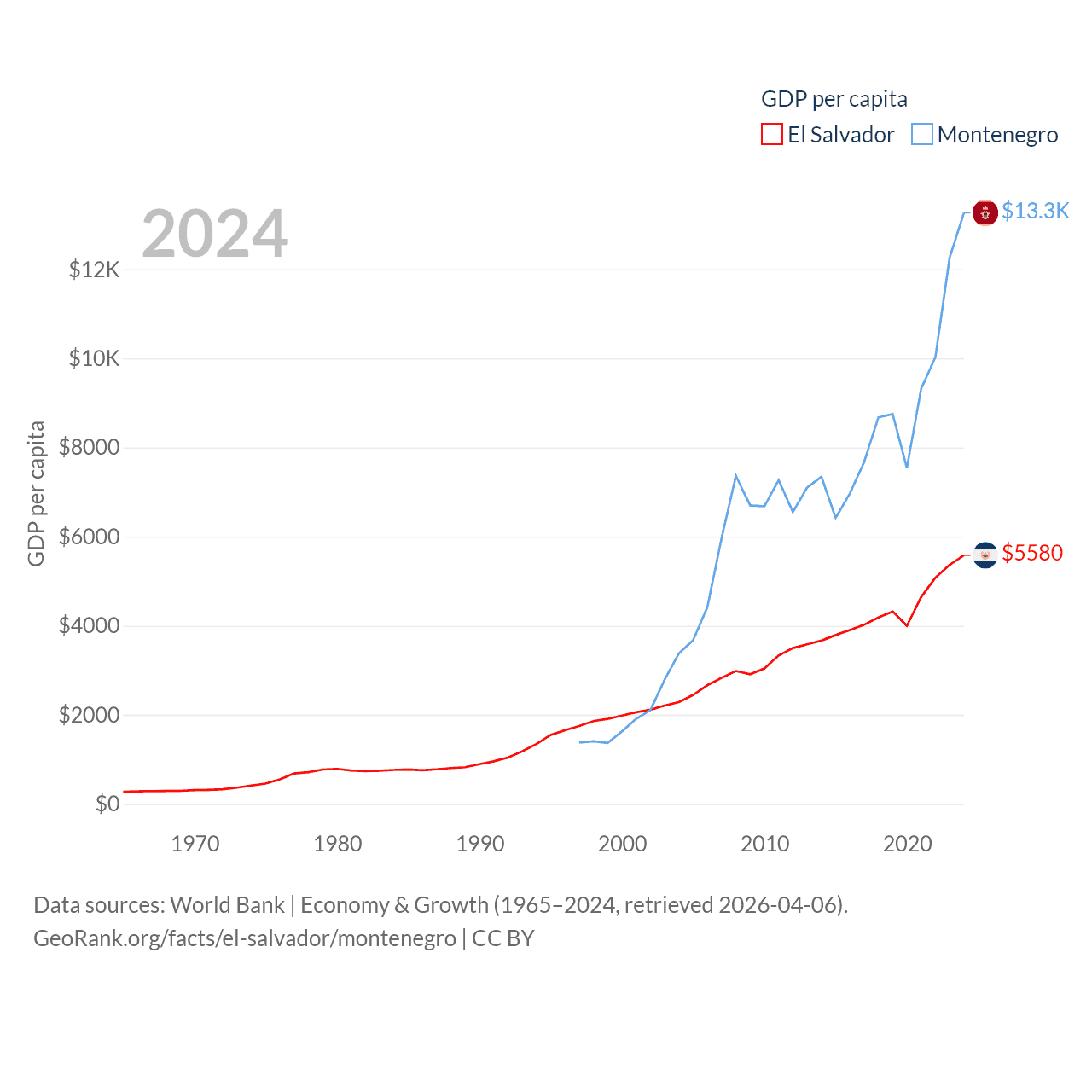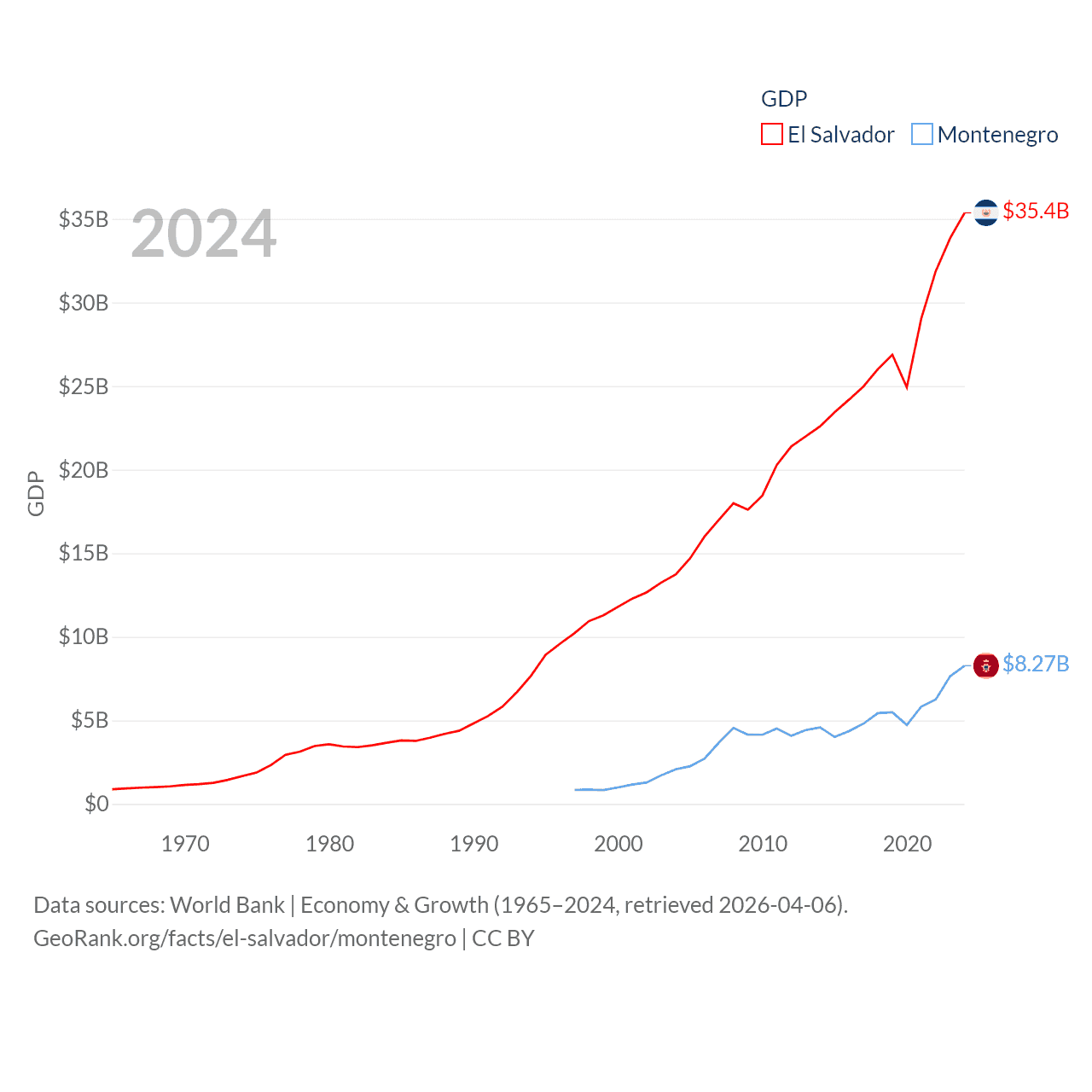 By GDP, El Salvador ranks 105/197 ($35.4B) and Montenegro ranks 155/197 ($8.27B). By GDP per capita, El Salvador ranks 116/197 ($5,580), while Montenegro ranks 77/197 ($13,263).