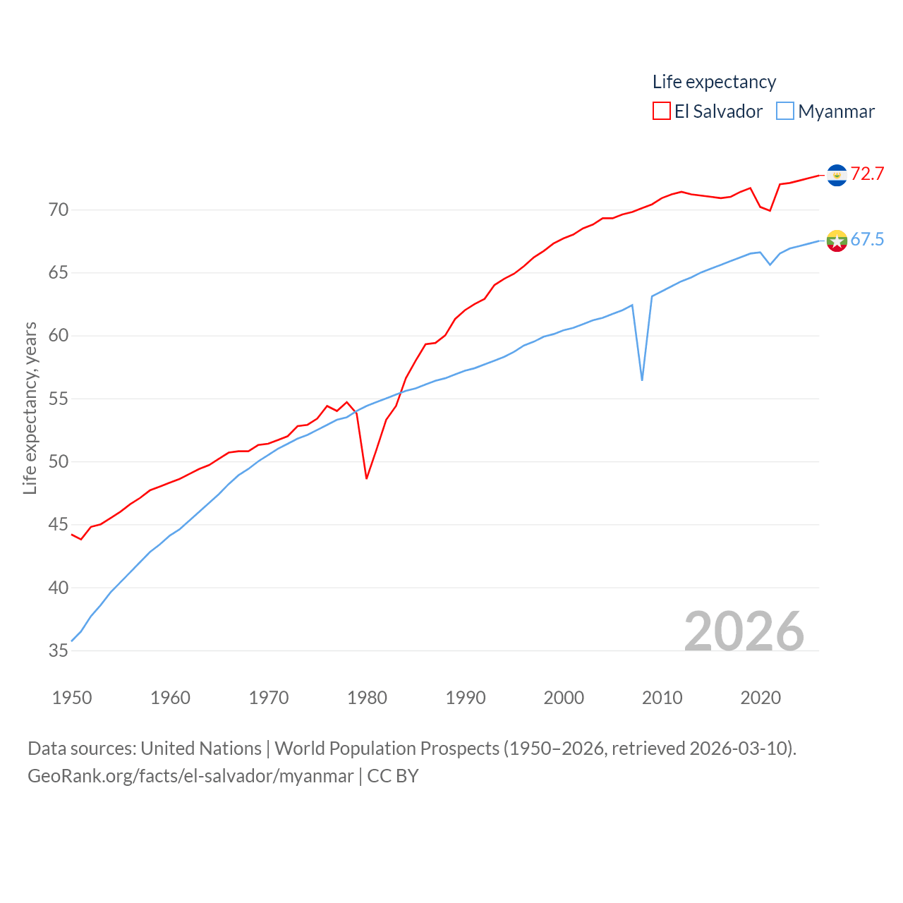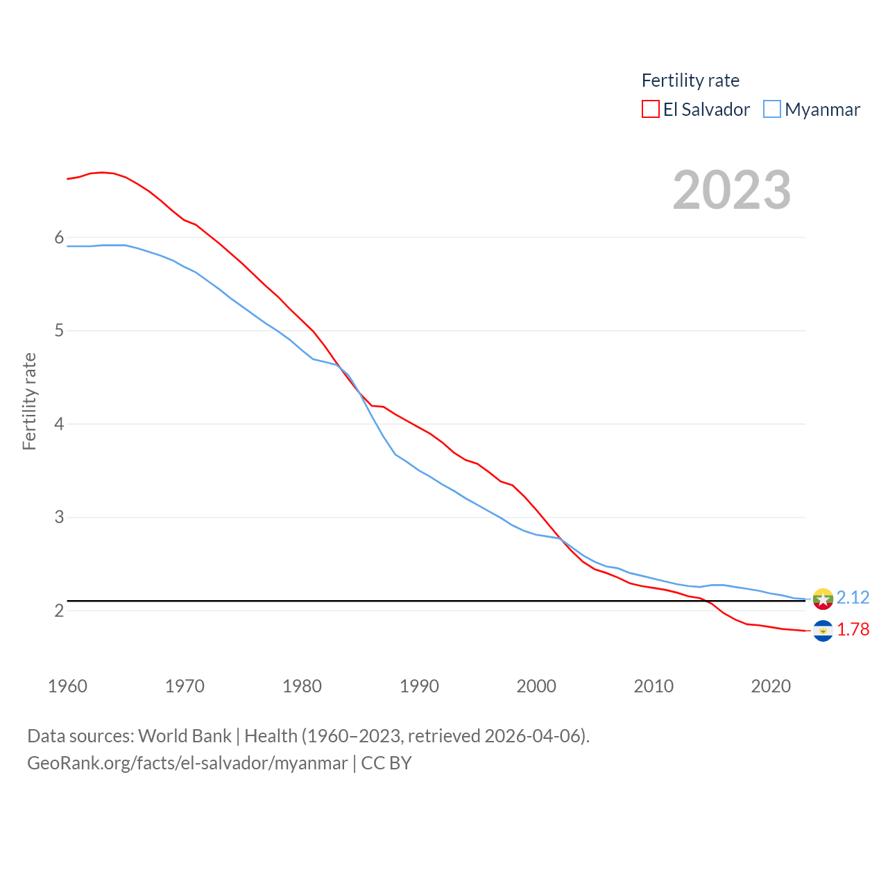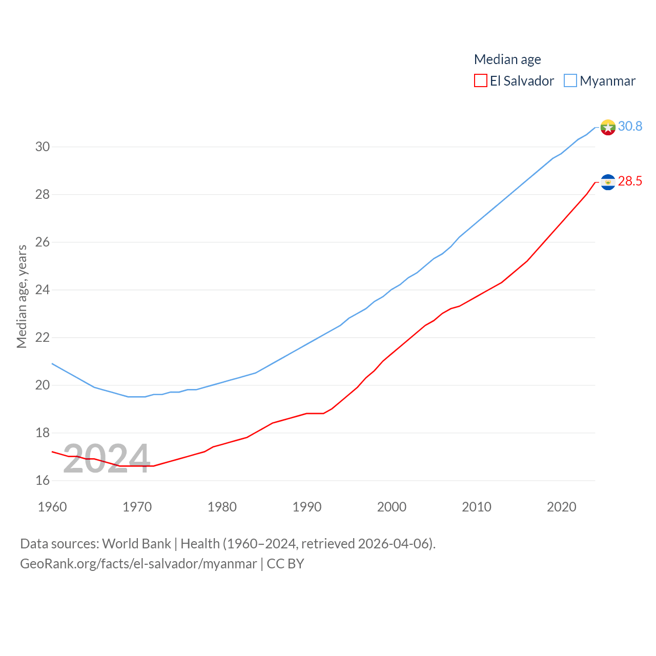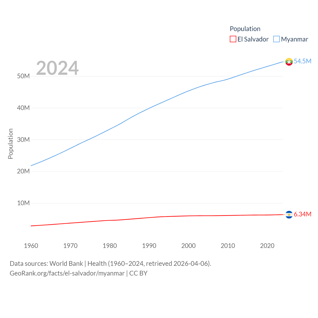 El Salvador has a population of 6.34M (ranked 111/197), compared with 54.5M in Myanmar (ranked 27/197). El Salvador's land area is 8,000 sq mi versus 251,997 sq mi for Myanmar (ranked 150th vs. 39th).