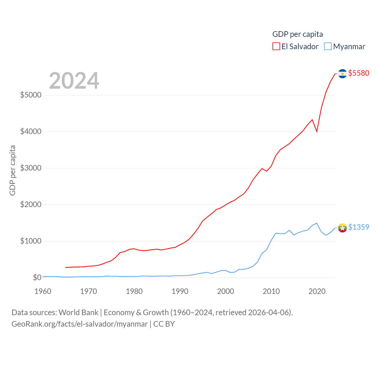 By GDP, El Salvador ranks 105/197 ($35.4B) and Myanmar ranks 85/197 ($74.1B). By GDP per capita, El Salvador ranks 116/197 ($5,580), while Myanmar ranks 165/197 ($1,359).
