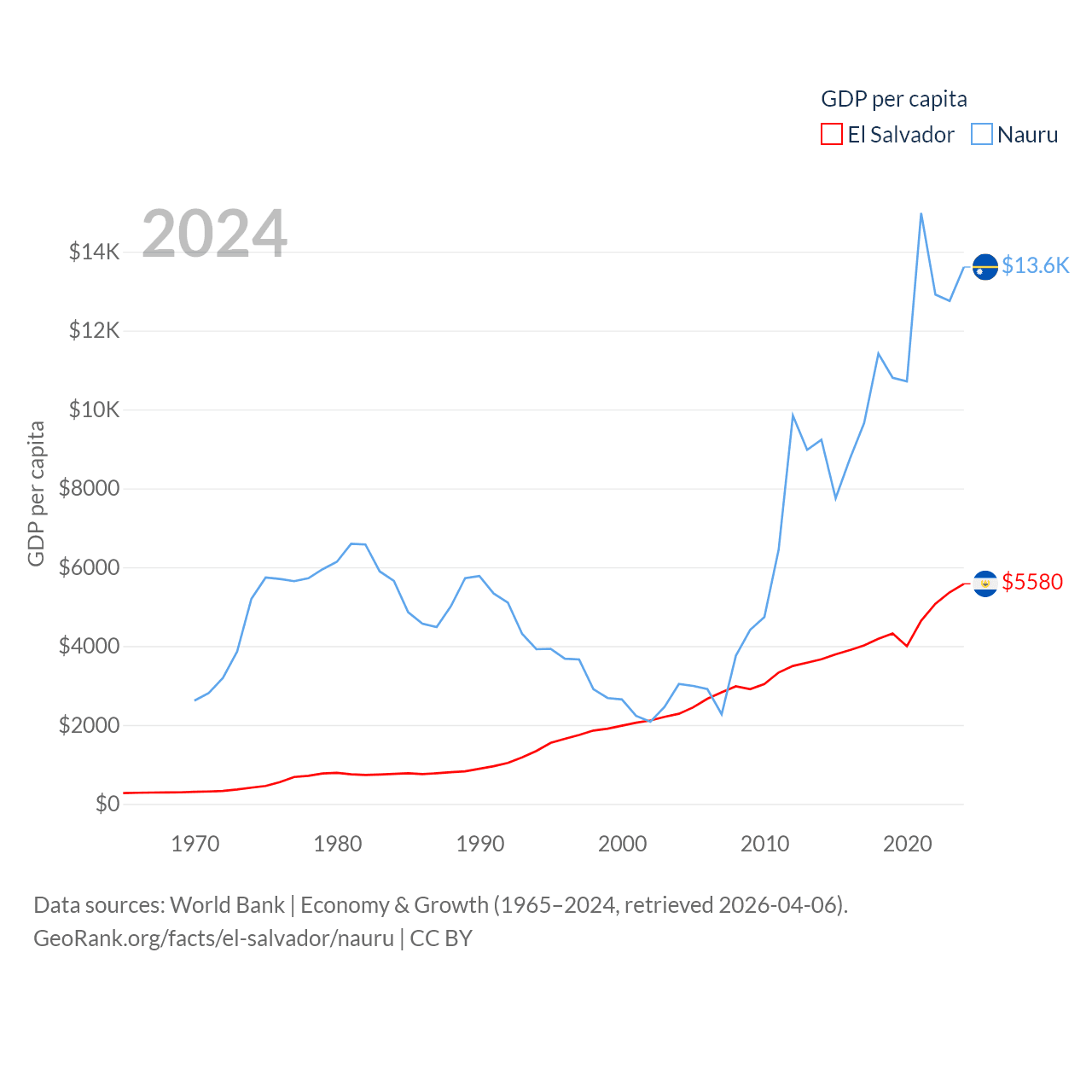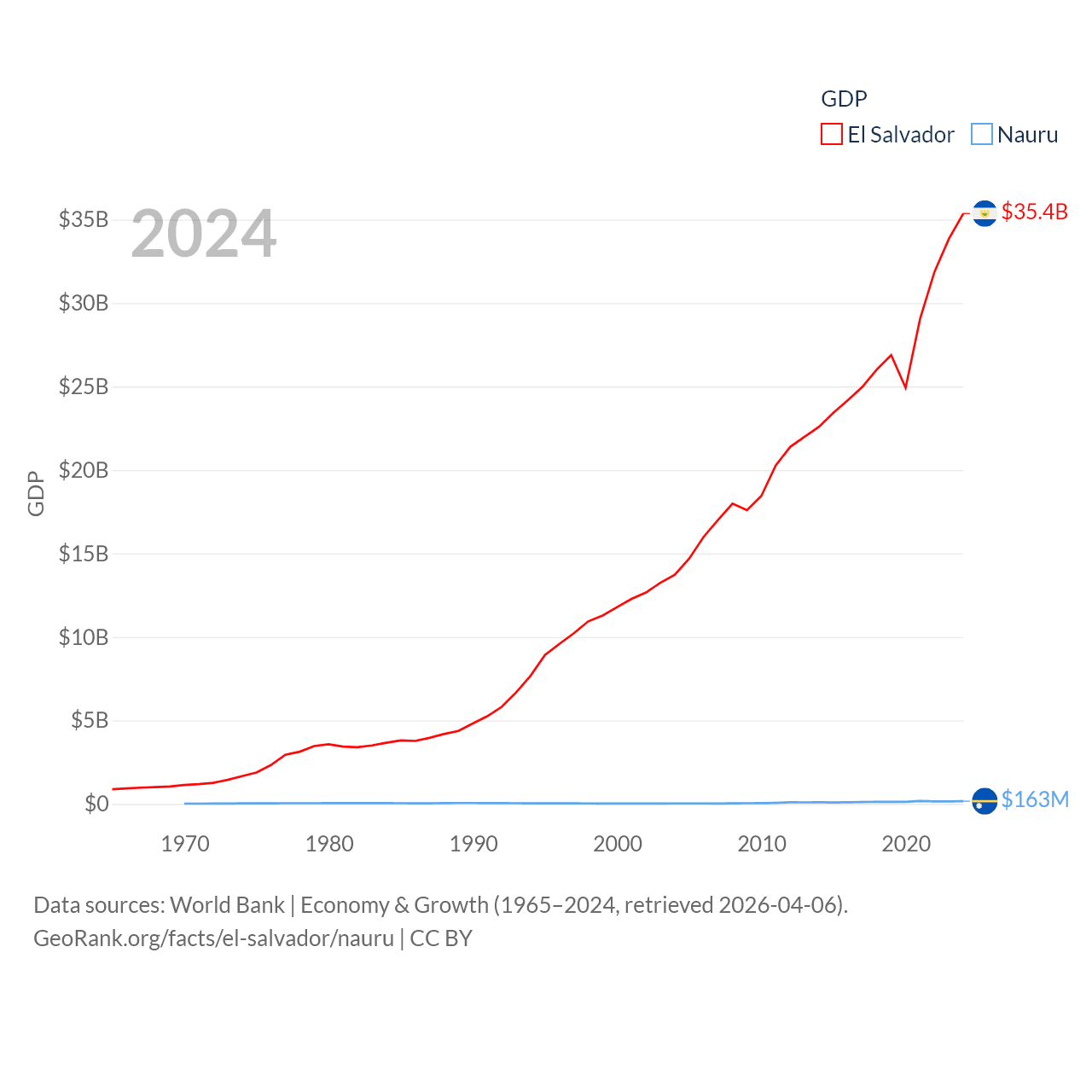 By GDP, El Salvador ranks 105/197 ($35.4B) and Nauru ranks 195/197 ($163M). By GDP per capita, El Salvador ranks 116/197 ($5,580), while Nauru ranks 74/197 ($13,609).