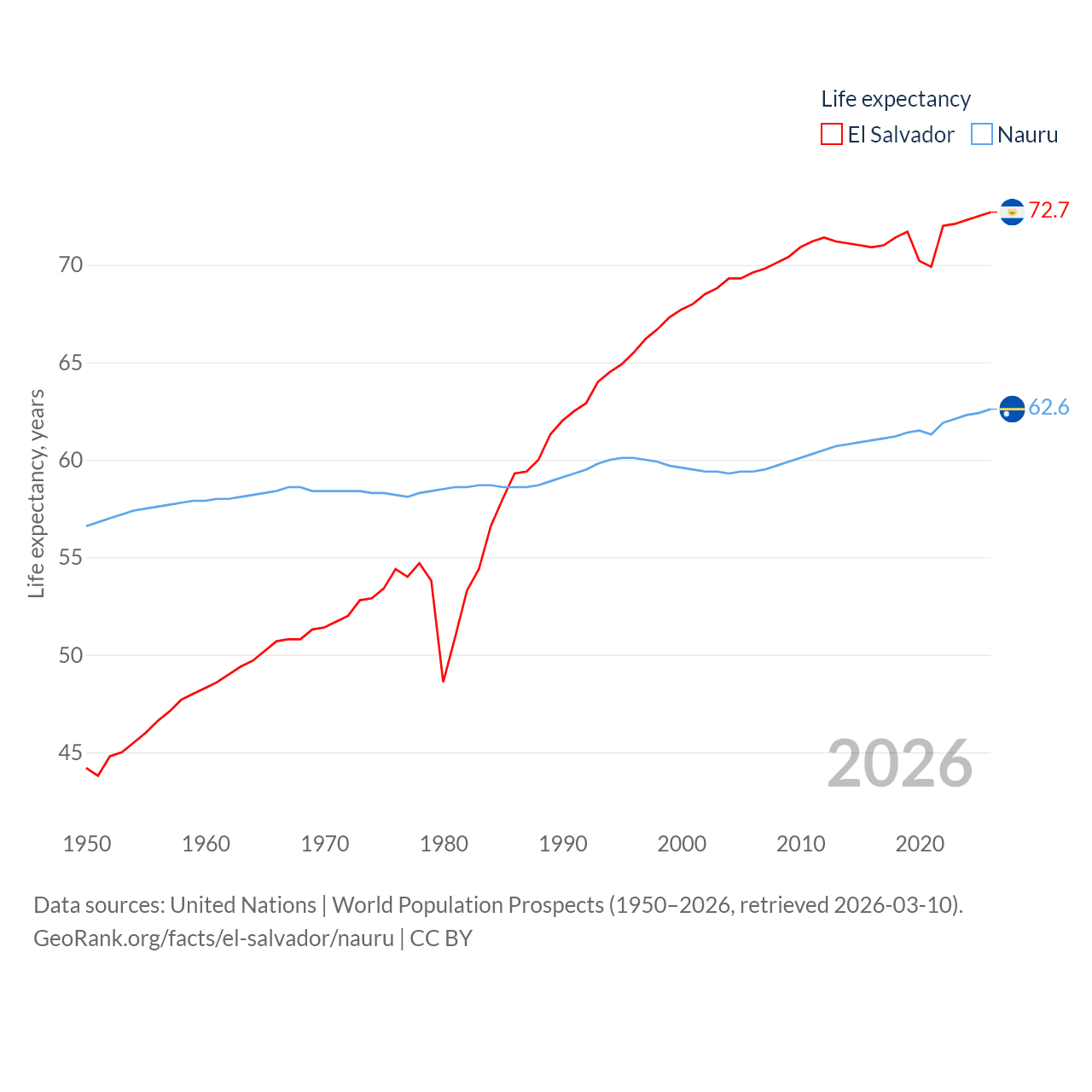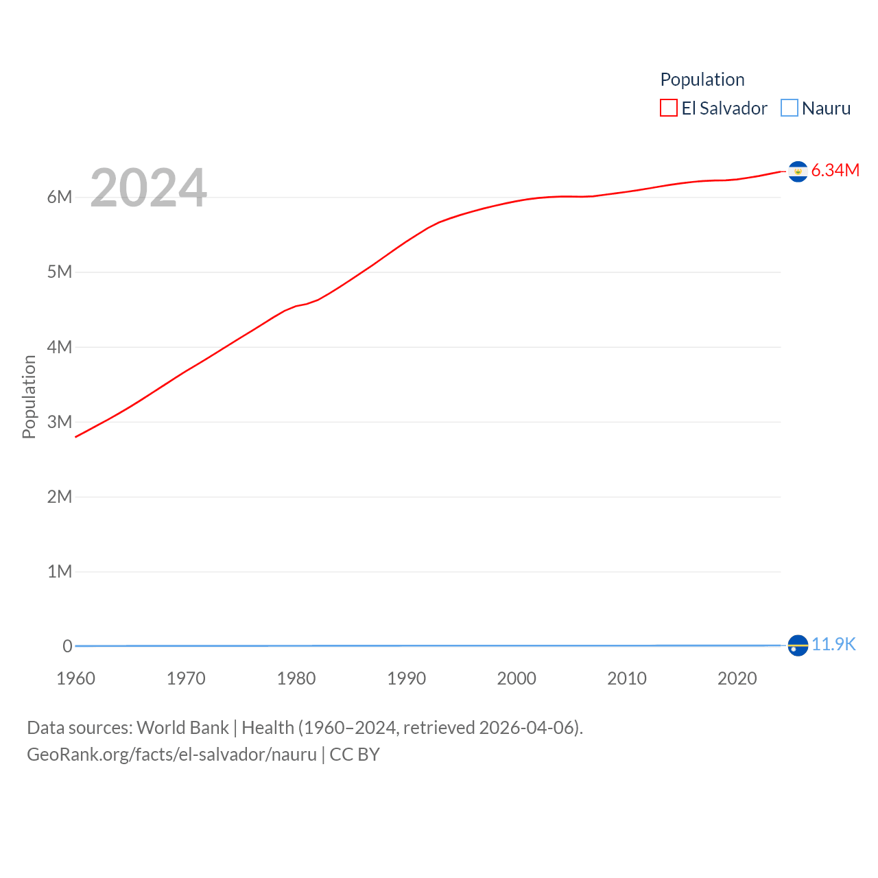 El Salvador has a population of 6.34M (ranked 111/197), compared with 11.9K in Nauru (ranked 195/197). El Salvador's land area is 8,000 sq mi versus 7.72 sq mi for Nauru (ranked 150th vs. 195th).