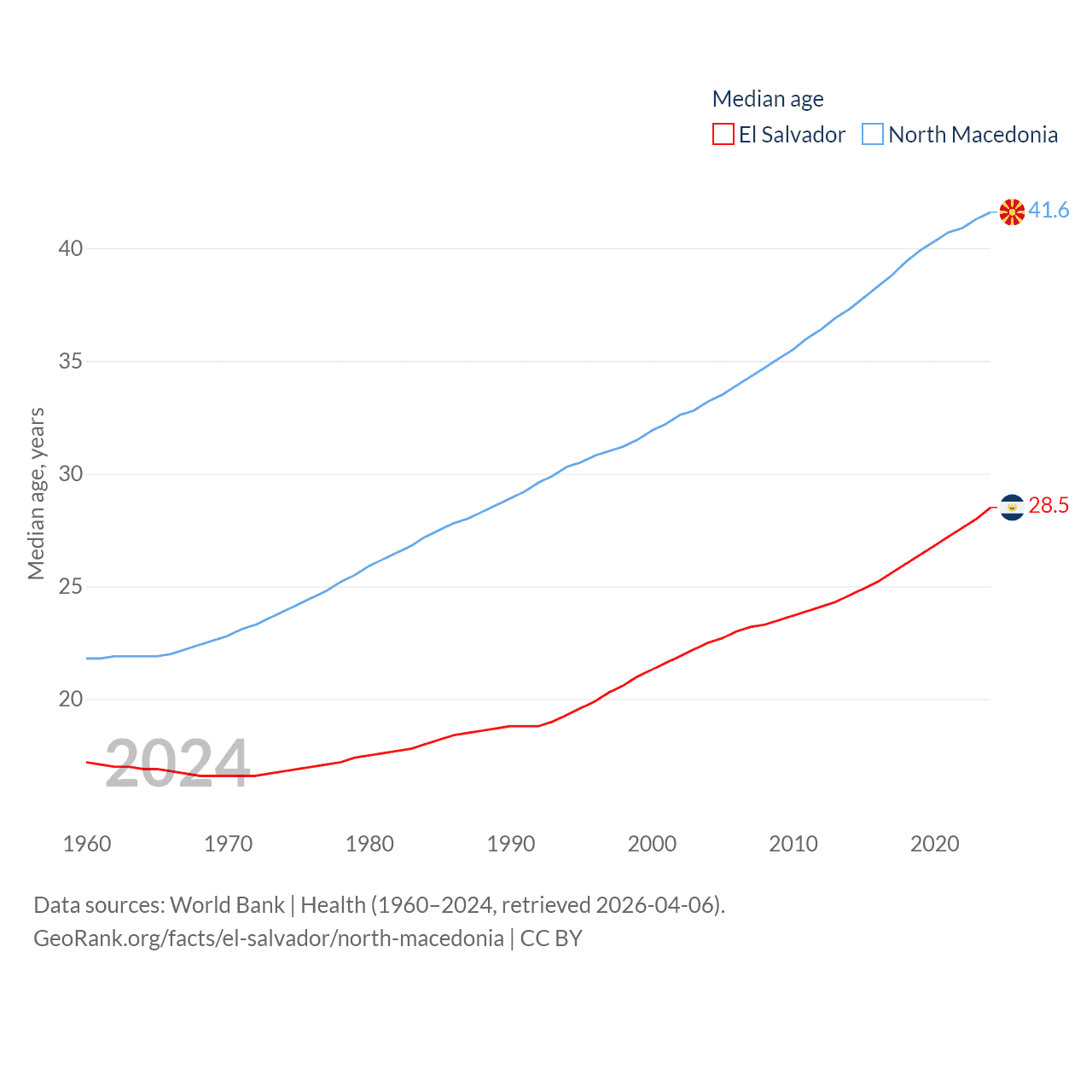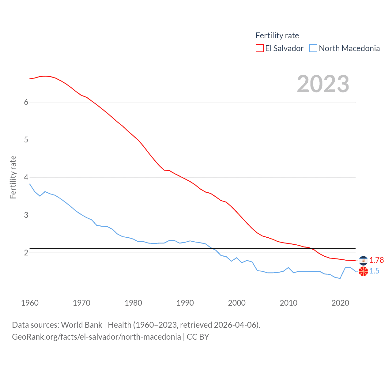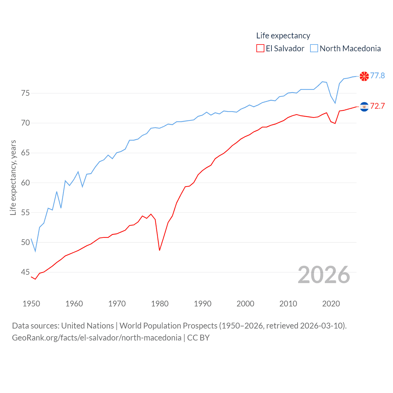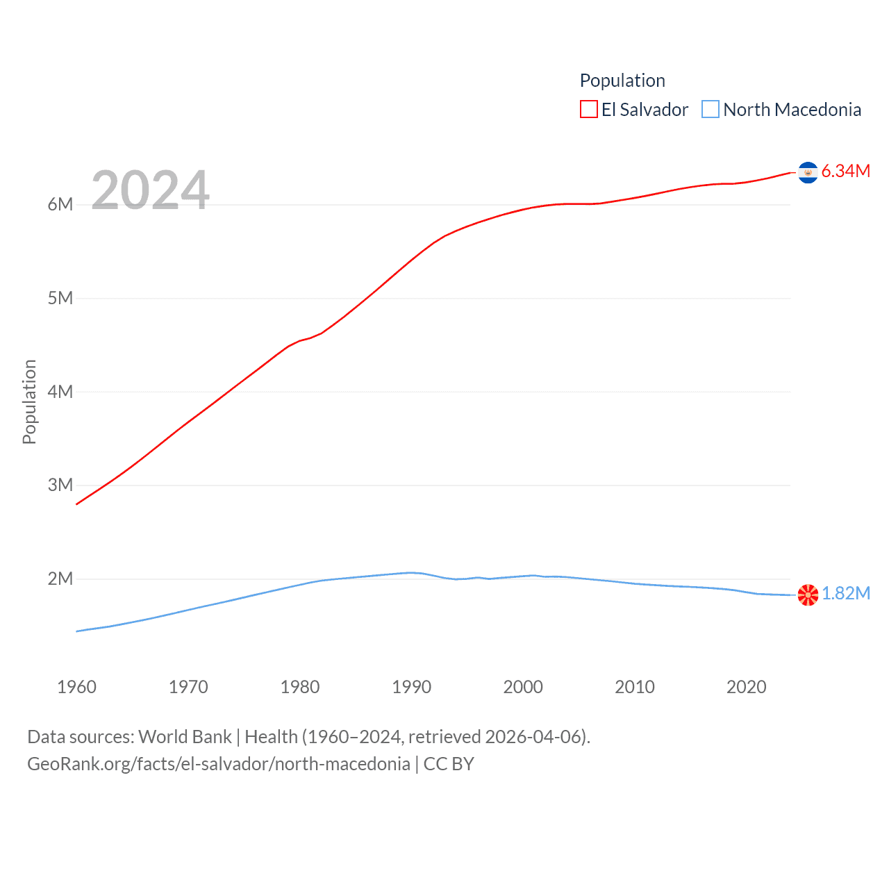 El Salvador has a population of 6.34M (ranked 111/197), compared with 1.82M in North Macedonia (ranked 150/197). El Salvador's land area is 8,000 sq mi versus 9,737 sq mi for North Macedonia (ranked 150th vs. 145th).