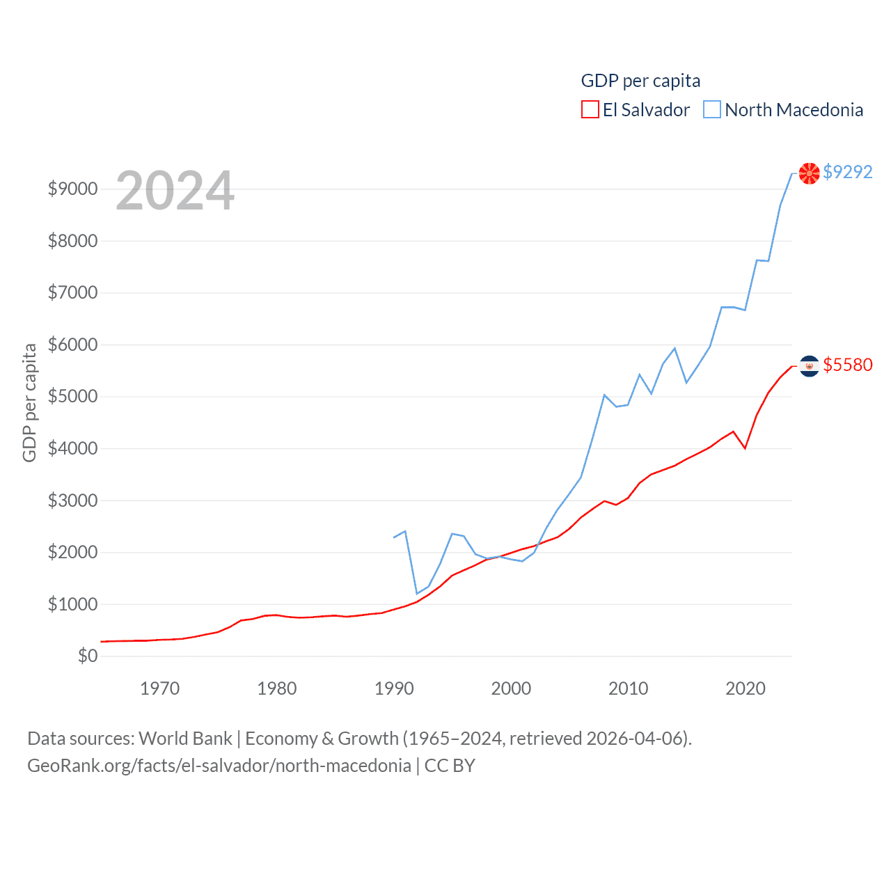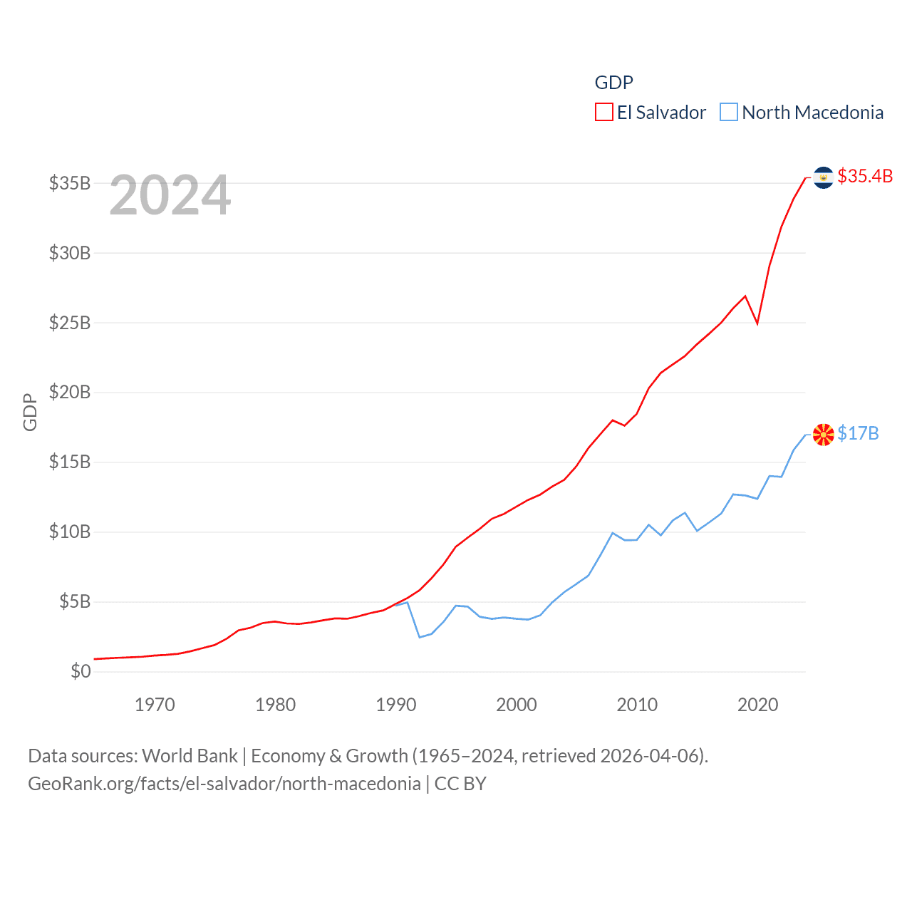 By GDP, El Salvador ranks 105/197 ($35.4B) and North Macedonia ranks 138/197 ($17B). By GDP per capita, El Salvador ranks 116/197 ($5,580), while North Macedonia ranks 88/197 ($9,292).
