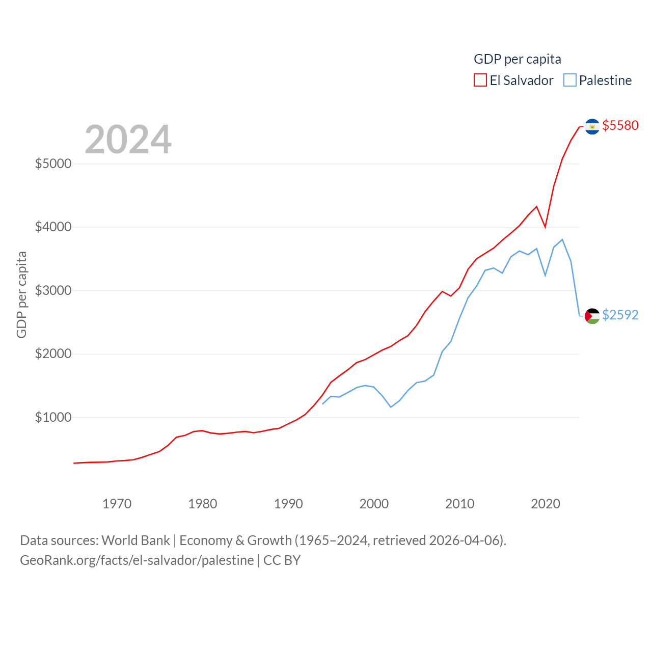 By GDP, El Salvador ranks 105/197 ($35.4B) and Palestine ranks 146/197 ($13.7B). By GDP per capita, El Salvador ranks 116/197 ($5,580), while Palestine ranks 147/197 ($2,592).