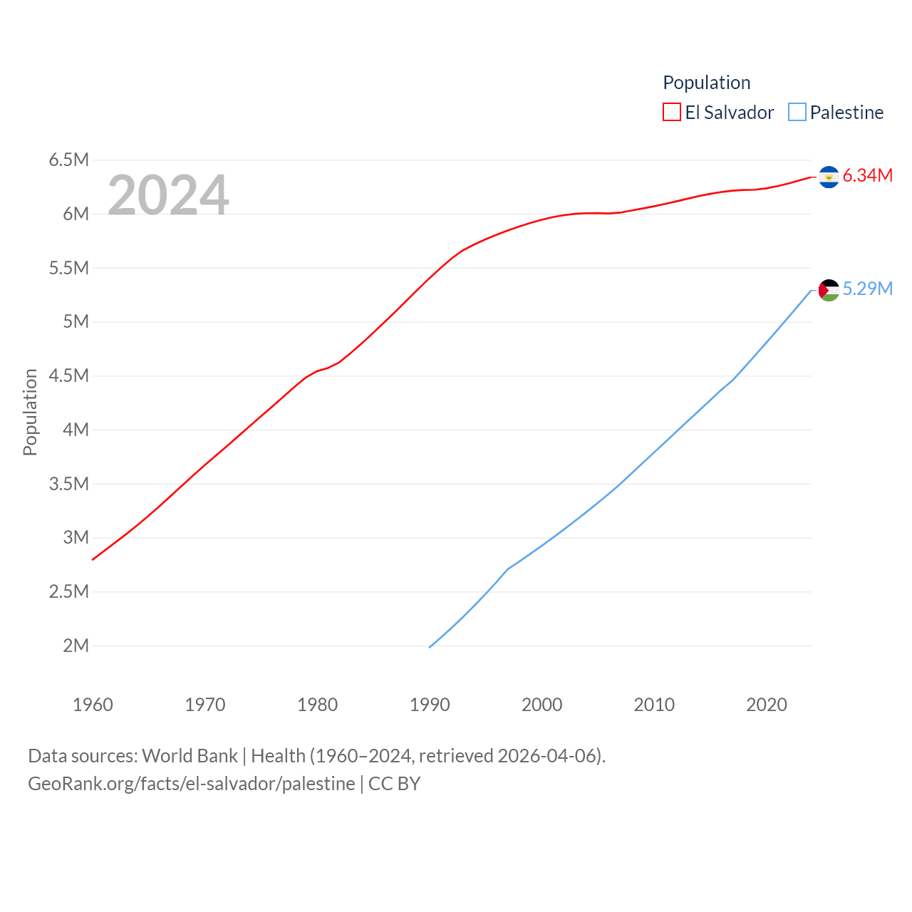 El Salvador has a population of 6.34M (ranked 111/197), compared with 5.29M in Palestine (ranked 122/197). El Salvador's land area is 8,000 sq mi versus 2,326 sq mi for Palestine (ranked 150th vs. 164th).