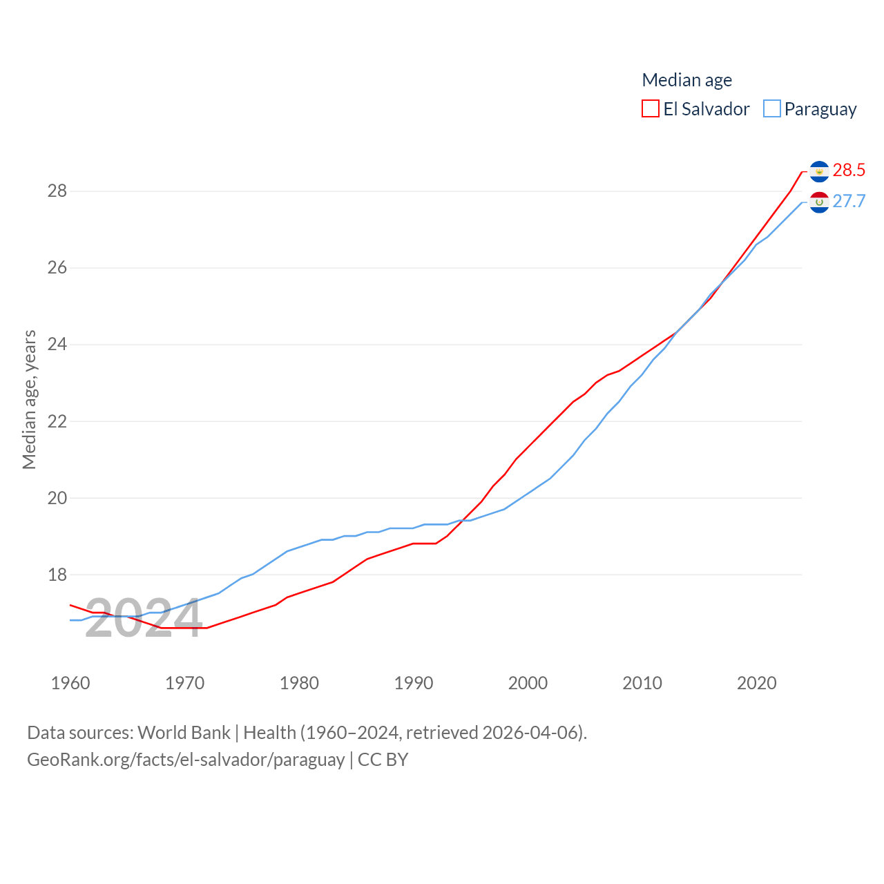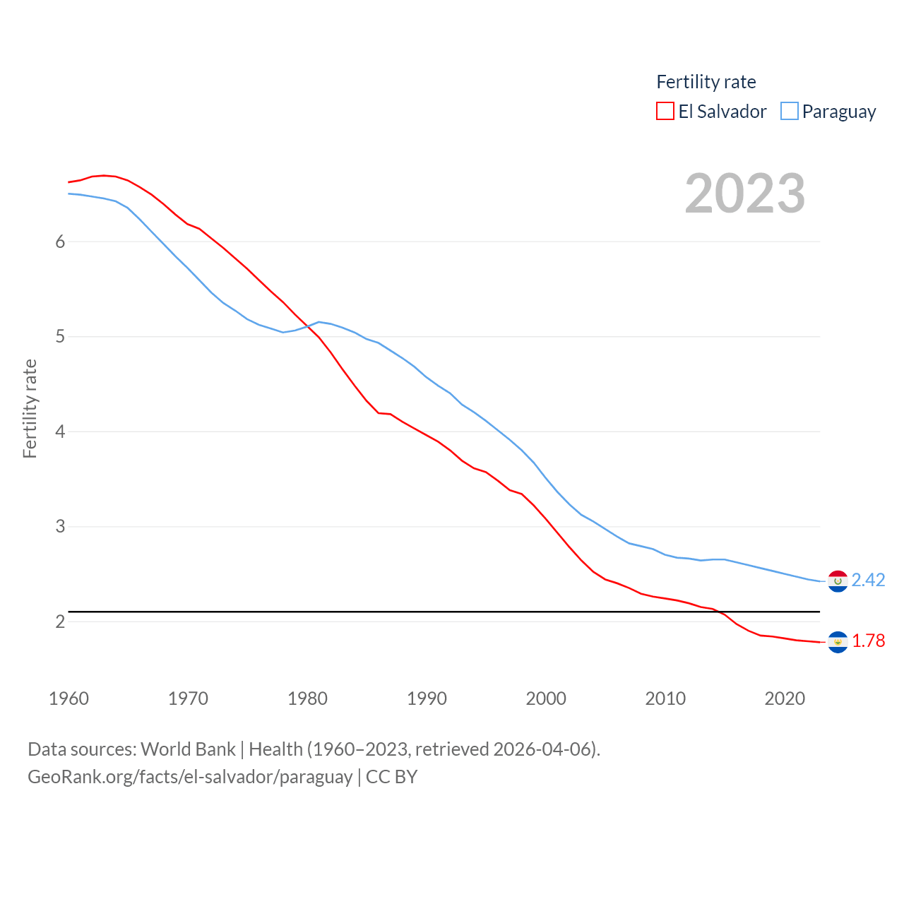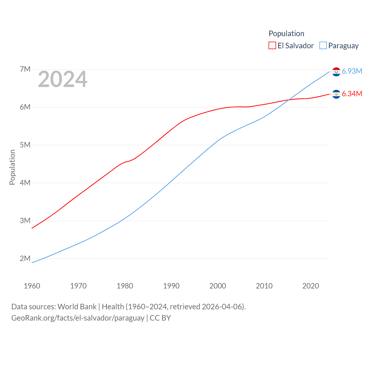 El Salvador has a population of 6.34M (ranked 111/197), compared with 6.93M in Paraguay (ranked 107/197). El Salvador's land area is 8,000 sq mi versus 152,901 sq mi for Paraguay (ranked 150th vs. 59th).