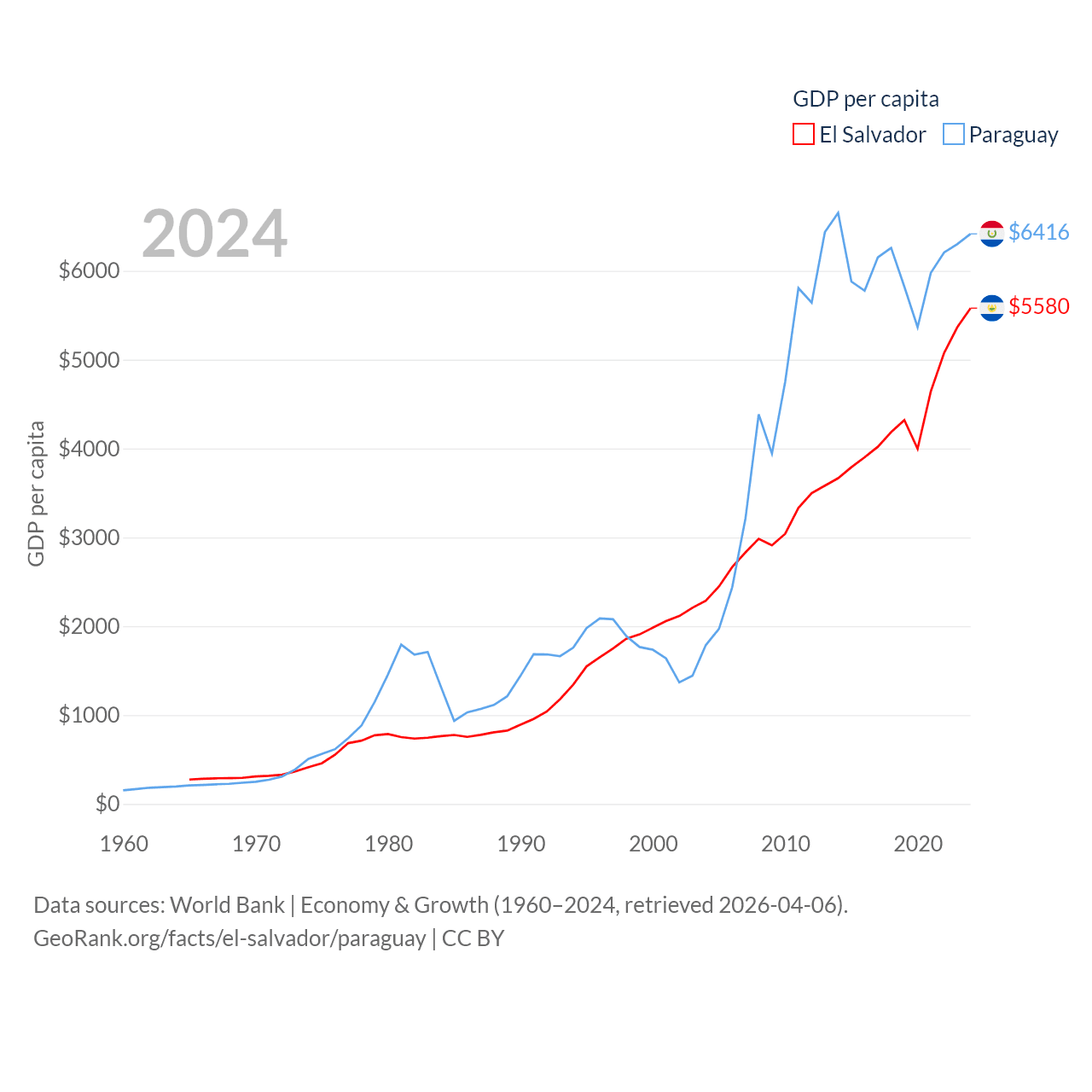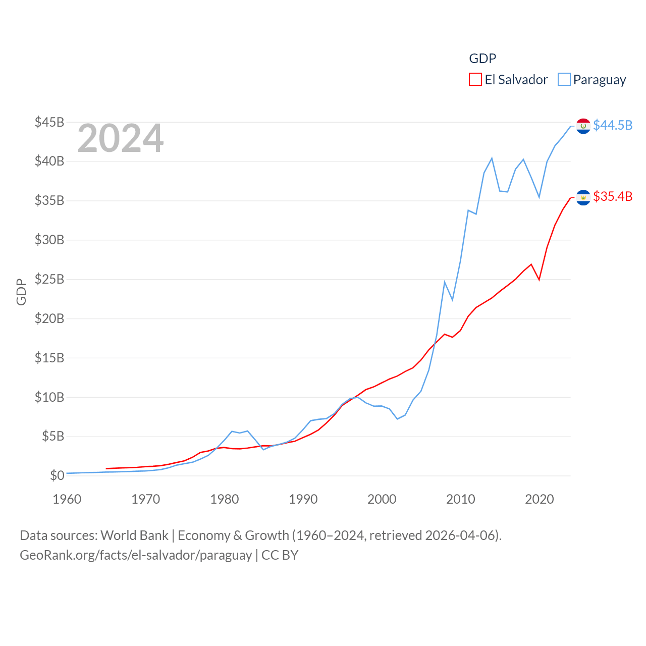 By GDP, El Salvador ranks 105/197 ($35.4B) and Paraguay ranks 98/197 ($44.5B). By GDP per capita, El Salvador ranks 116/197 ($5,580), while Paraguay ranks 109/197 ($6,416).